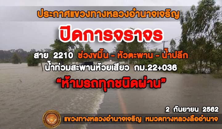 วันที่ 2 กันยายน 2562 แขวงทางหลวงอำนาจเจริญ แจ้งปิดการจราจรในทางหลวงหมายเลข 2210 ช่วงบ้านขมิ้น - อำเภอหัวตะพาน - บ้านน้ำปลีก ระหว่าง กม.21+950 - 22+200 (บริเวณสะพานห้วยเสียว) เนื่องจากมีฝนตกหนักตลอดทั้งคืน ทำให้บริเวณดังกล่าวมีน้ำท่วมผิวจราจรสูง รถทุกชนิดไม่สามารถสัญจรผ่านได้ ทั้งนี้นายกฤษณะ ทองย้อย หัวหน้าหมวดทางหลวงลืออำนาจและเจ้าหน้าที่ ได้บูรณาการร่วมกับทหาร นพค.51 ทต.หัวตะพาน ทำการติดตั้งป้ายเตือนพร้อมอุปกรณ์อำนวยความปลอดภัย และเฝ้าติดตามสถานการณ์อย่างใกล้ชิด