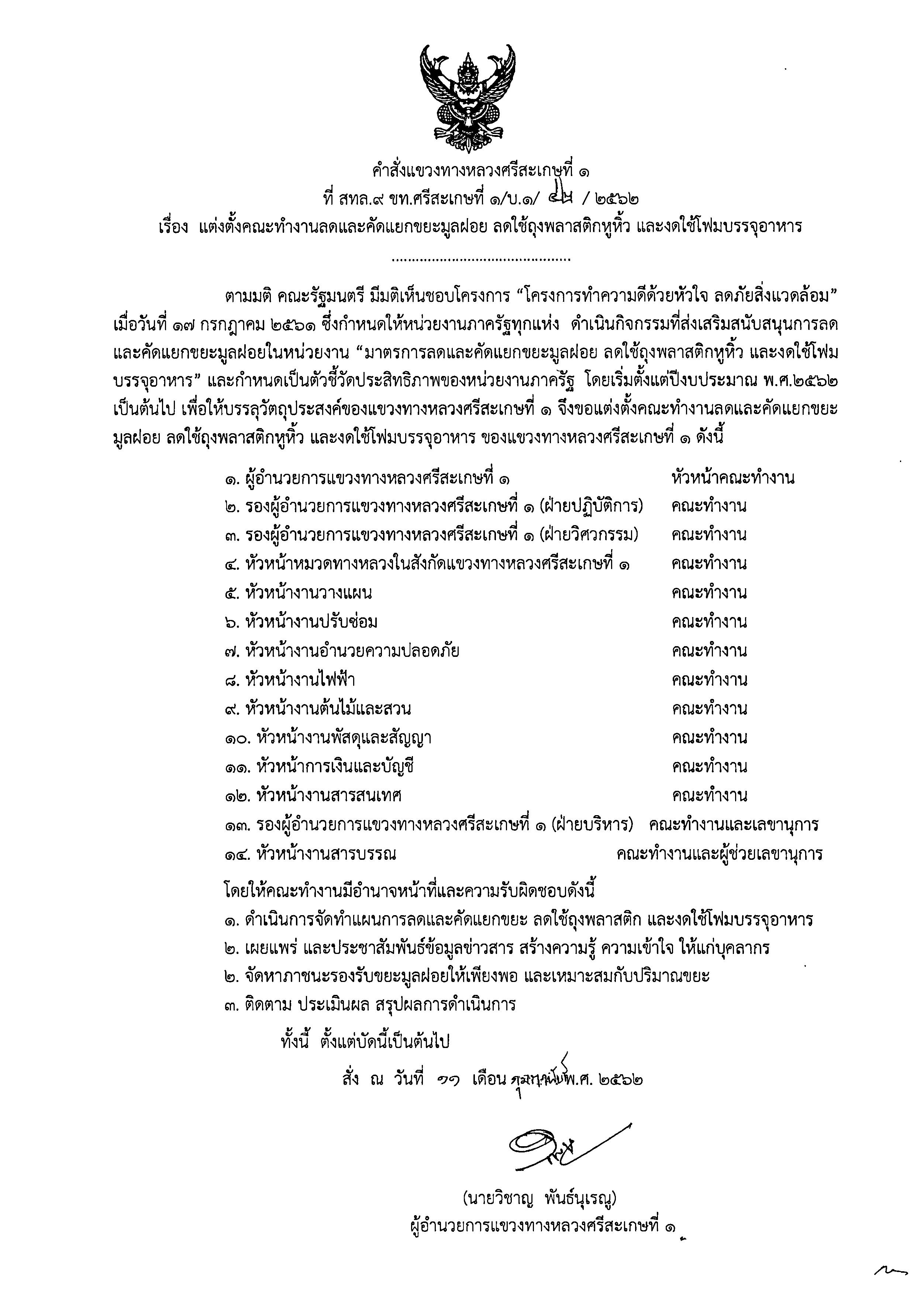 แขวงทางหลวงศรีสะเกษที่ 1 โดย นายวิชาญ พันธ์นุเรณู ผู้อำนวยการแขวงทางหลวงศรีสะเกษที่ 1 ได้ให้ความสำคัญในการช่วยลดภาวะโลกร้อน และการสร้างอุปนิสัย การคัดแยกขยะ ให้แก่ เจ้าหน้าที่แขวงทางหลวงศรีสะเกษที่ 1 และเจ้าหน้าที่หมวดทางหลวงในสังกัด ซึ่งเป็นจุดเริ่มต้นของการรับผิดชอบต่อสังคม
