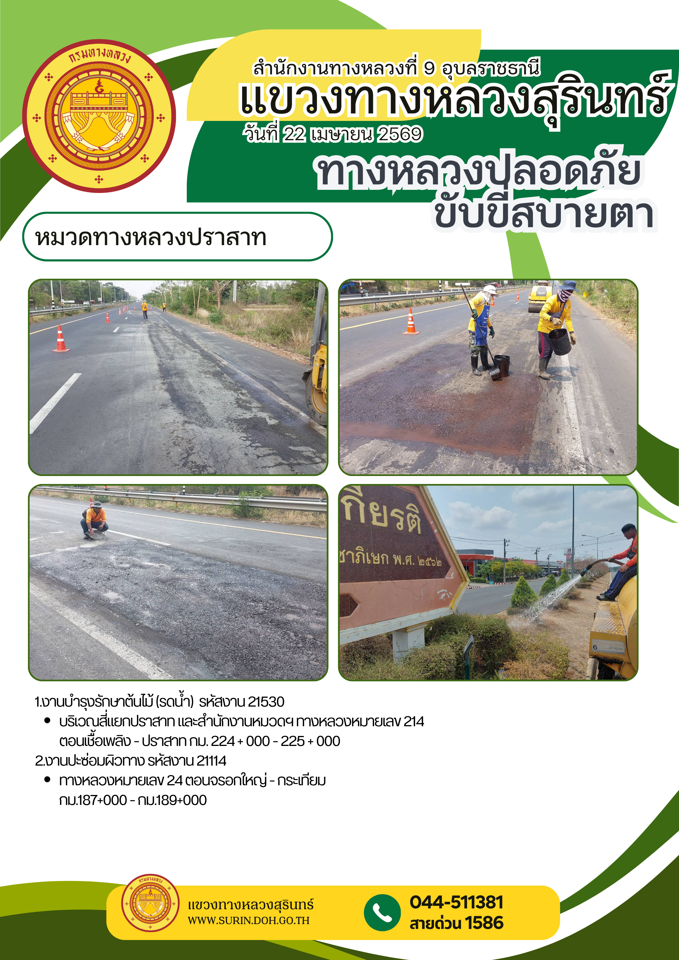 ทางหลวงปลอดภัย ขับขี่สบายตา 22 เมษายน 2569 |
