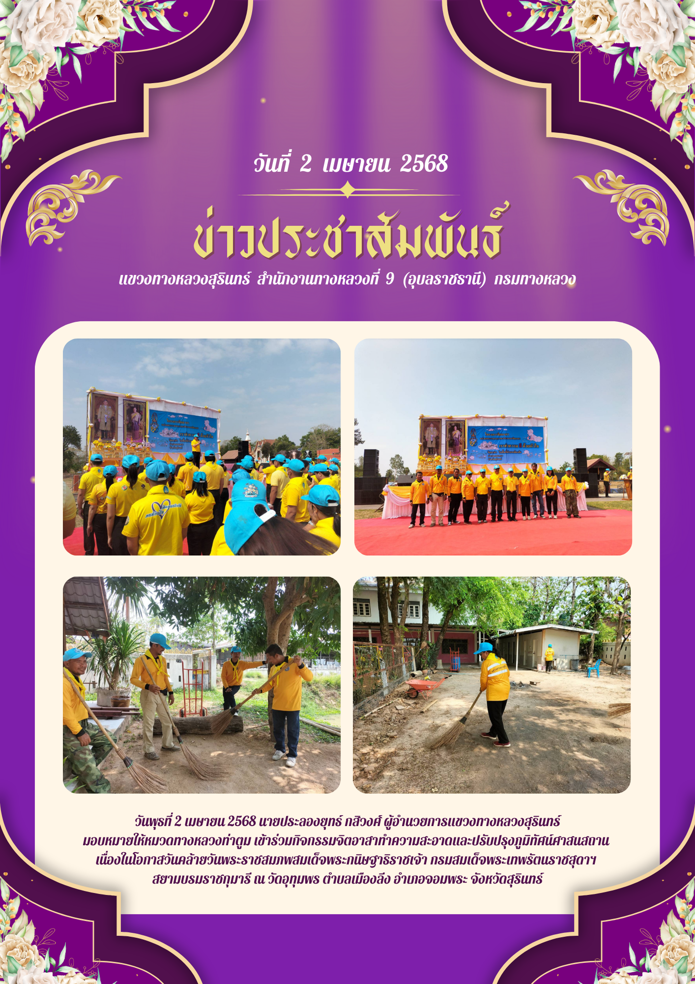 ร่วมกิจกรรมจิตอาสาทำความสะอาดและปรับปรุงภูมิทัศน์ศาสนสถาน เนื่องในโอกาสวันคล้ายวันพระราชสมภพสมเด็จพระกนิษฐาธิราชเจ้า กรมสมเด็จพระเทพรัตนราชสุดาฯ