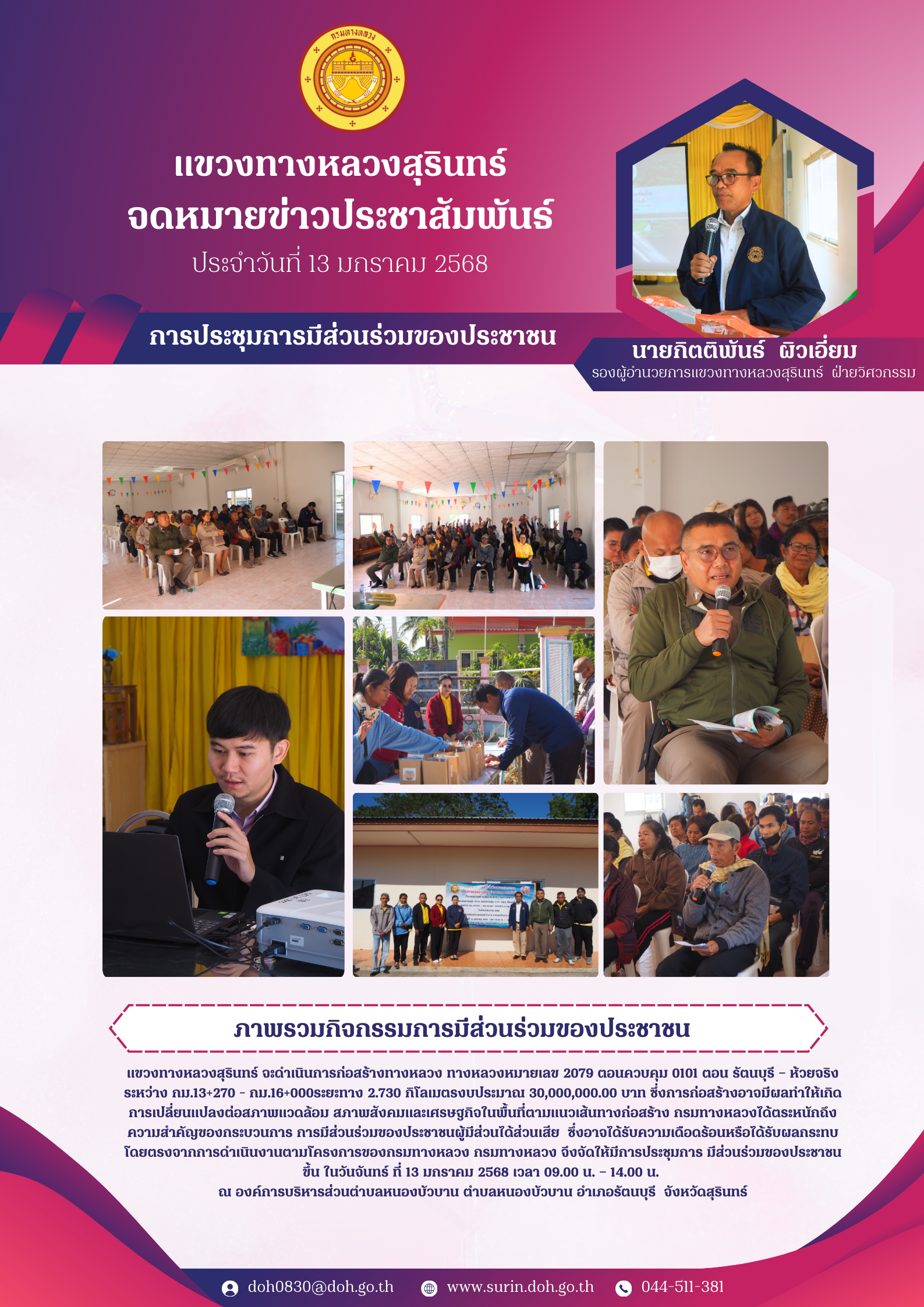 รายงานสรุปผลการดำเนินงานการมีส่วนร่วมของประชาชน ทางหลวงหมายเลข 2079 ตอนควบคุม 0101 ตอน รัตนบุรี – ห้วยจริง ระหว่าง กม.13+270 - กม.16+000 ระยะทาง 2.730 กิโลเมตร