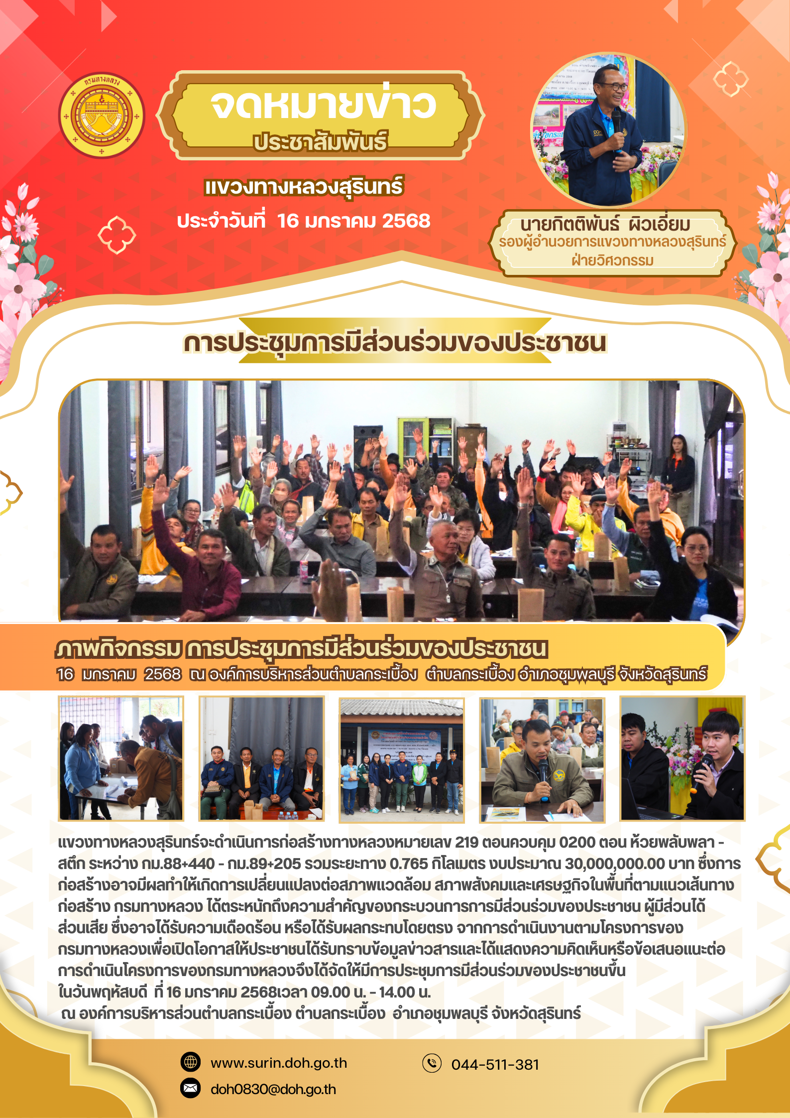 รายงานสรุปผลการดำเนินงานการมีส่วนร่วมของประชาชน ทางหลวงหมายเลข 219 ตอนควบคุม 0200 ตอน ห้วยพลับพลา - สตึก ระหว่าง กม.88+440 - กม.89+205 รวมระยะทาง 0.765 กิโลเมตร