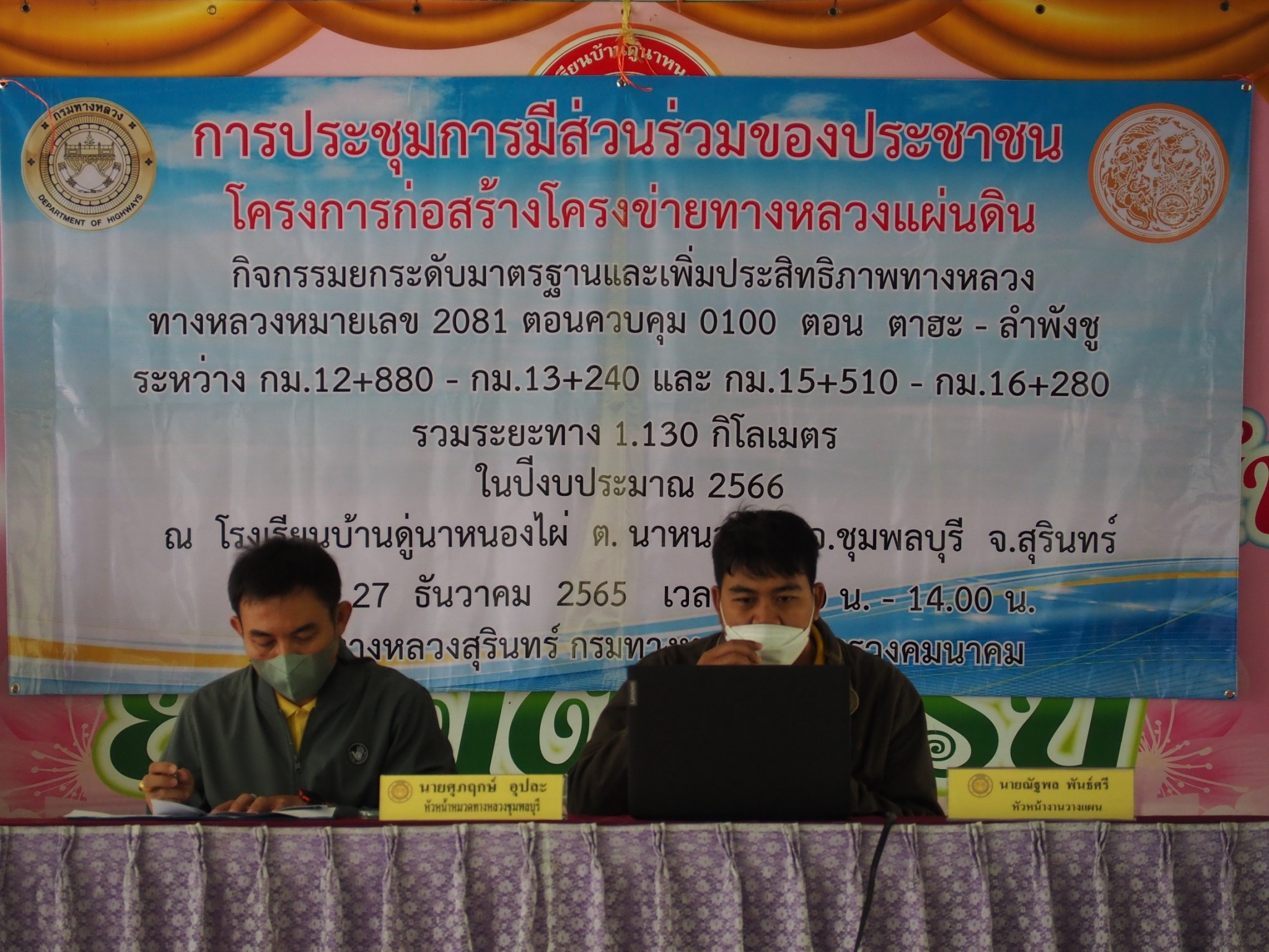 แขวงทางหลวงสุรินทร์ ได้ดำเนินการจัดการมีส่วนร่วมของประชาชน ปีงบประมาณ 2566 โครงการก่อสร้างโครงข่ายทางหลวงแผ่นดิน สำหรับ กิจกรรมยกระดับมาตรฐานและเพิ่มประสิทธิภาพทางหลวง ทางหลวงหมายเลข 2081 ตอนควบคุม 0100 ตอน ตาฮะ - ลำพังชู ระหว่าง กม.12+880 - กม.13+240 และ กม.15+510 - กม.16+280 ระยะทาง 1.130 กิโลเมตร โดยดำเนินการประชุมในวันอังคาร ที่ 27 ธันวาคม 2565 เวลา 09.00 น. - 14.00 น. ณ โรงเรียนบ้านดู่นาหนองไผ่ ตำบลไพรขลา อำเภอชุมพลบุรี จังหวัดสุรินทร์ เสร็จเรียบร้อยแล้ว