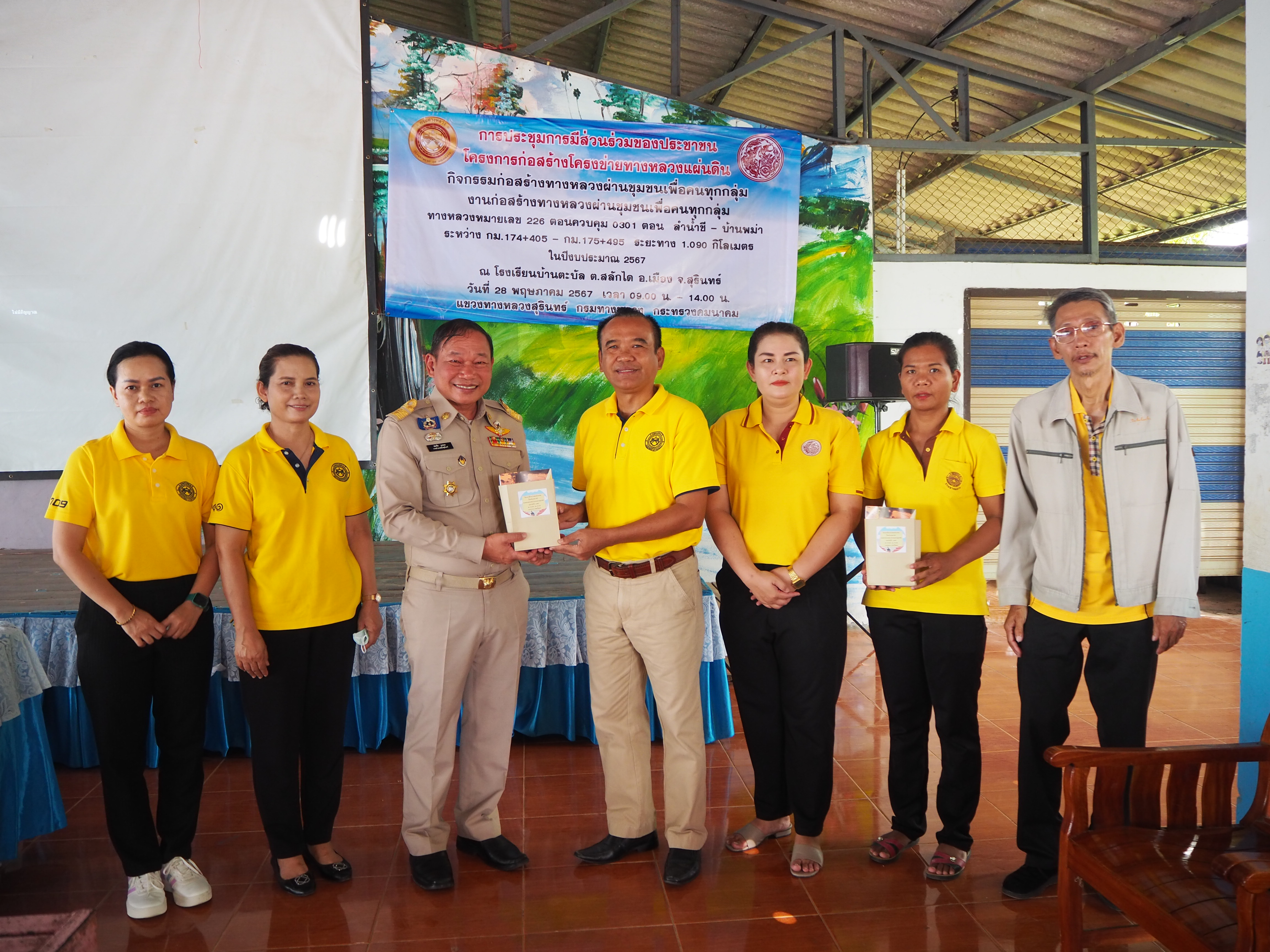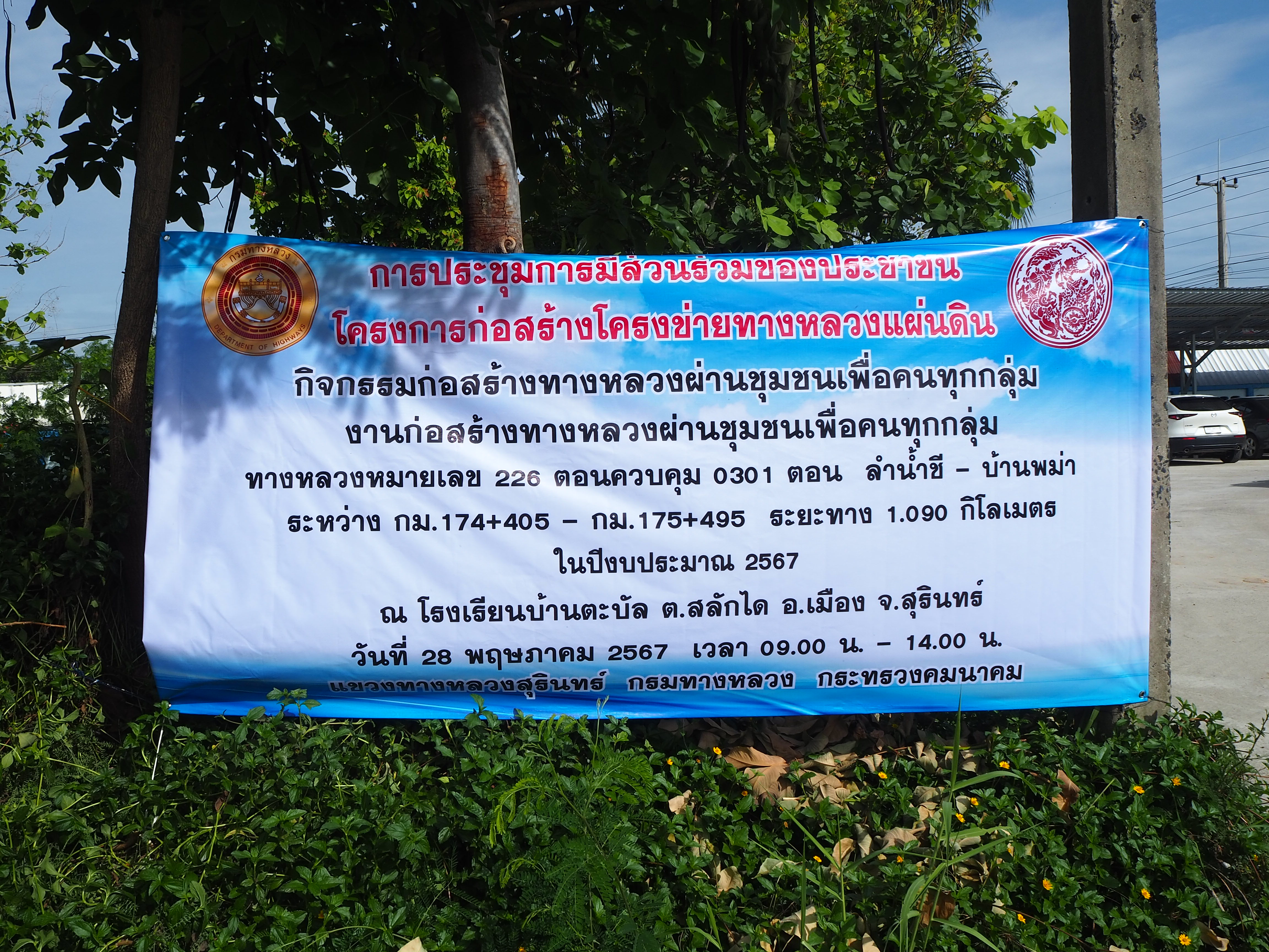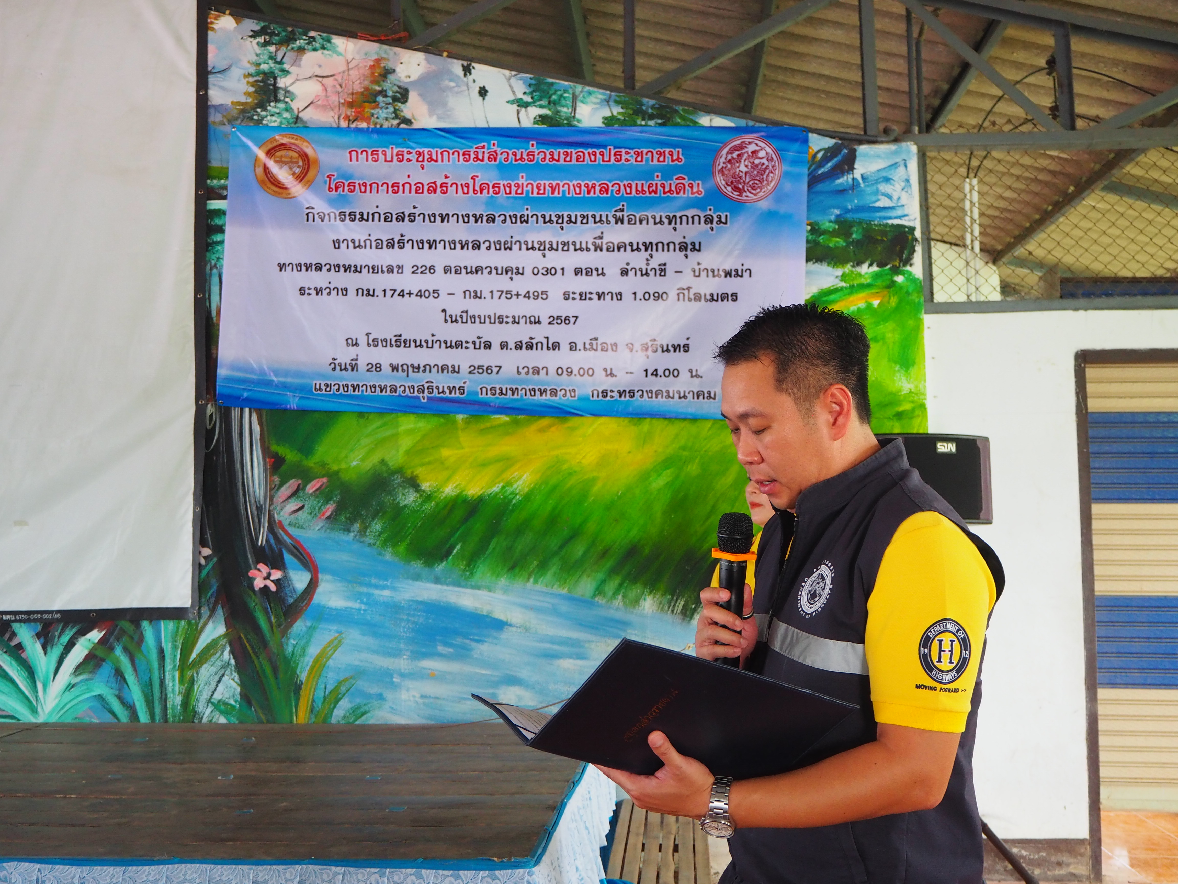 แขวงทางหลวงสุรินทร์ ได้ดำเนินการจัดการมีส่วนร่วมของประชาชน ปีงบประมาณ 2567 โครงการก่อสร้างโครงข่ายทางหลวงแผ่นดิน สำหรับ กิจกรรมยกระดับมาตรฐานและเพิ่มประสิทธิภาพทางหลวง ทางหลวงหมายเลข 226 ตอนควบคุม 0301 ตอน ลำน้ำชี - บ้านพม่า ระหว่าง กม.174+405 - กม.175+495 ระยะทาง 1.090 กิโลเมตร โดยดำเนินการประชุมในวันอังคารที่ 28 พฤษภาคม 2567 เวลา 09.00 น. - 14.00 น. ณ โรงเรียนบ้านตะบัล ตำบลสลักได อำเภอเมือง จังหวัดสุรินทร์ เสร็จเรียบร้อยแล้ว