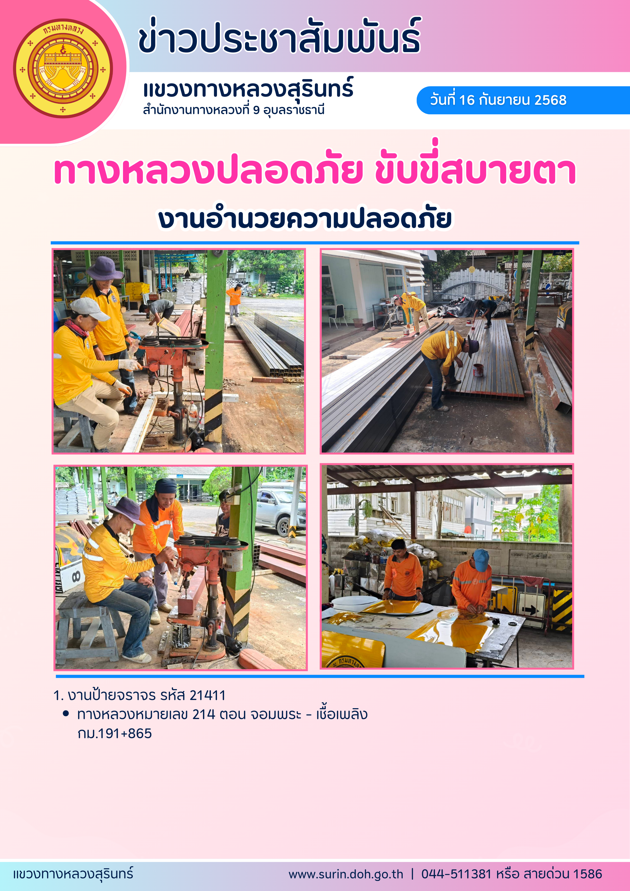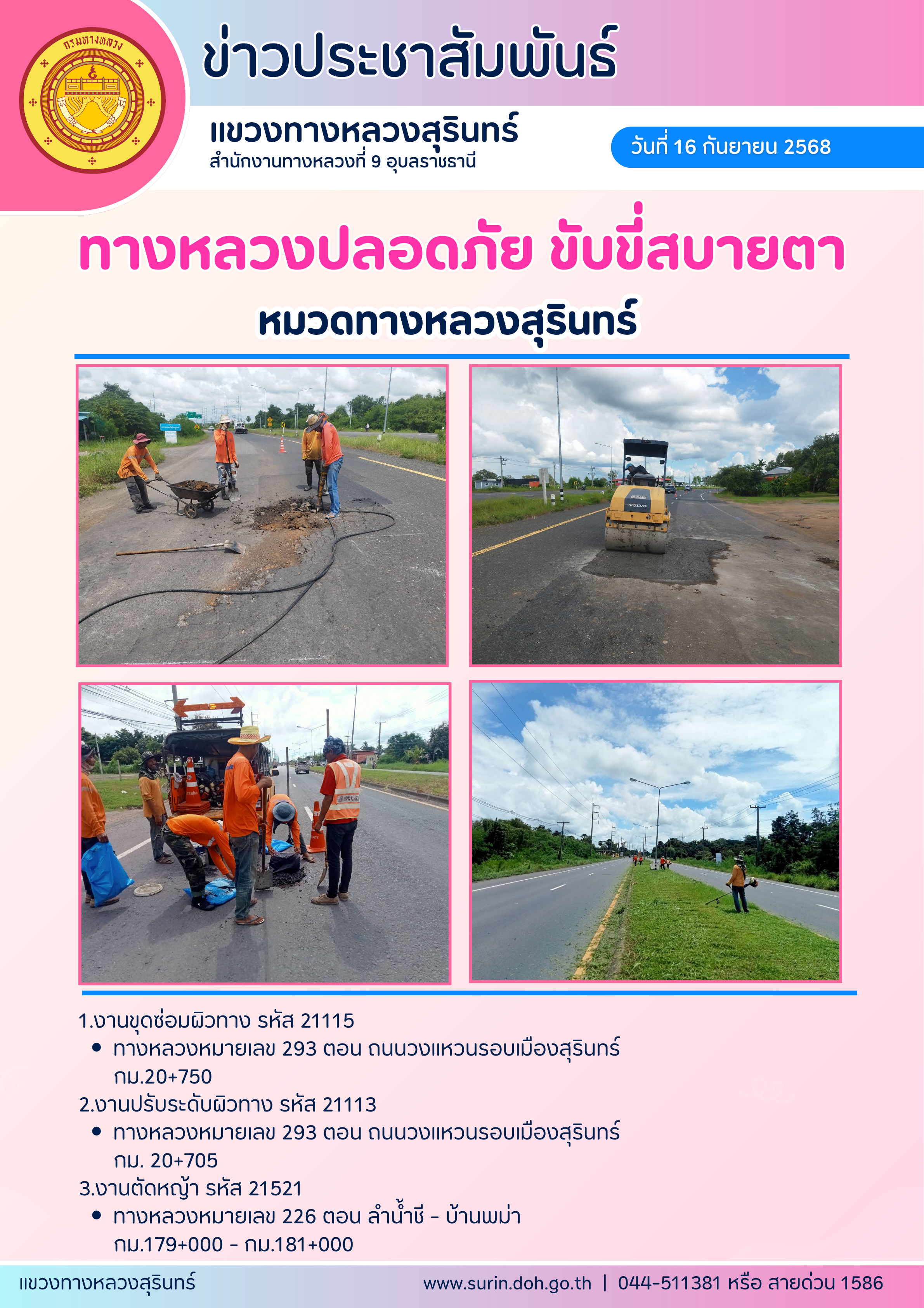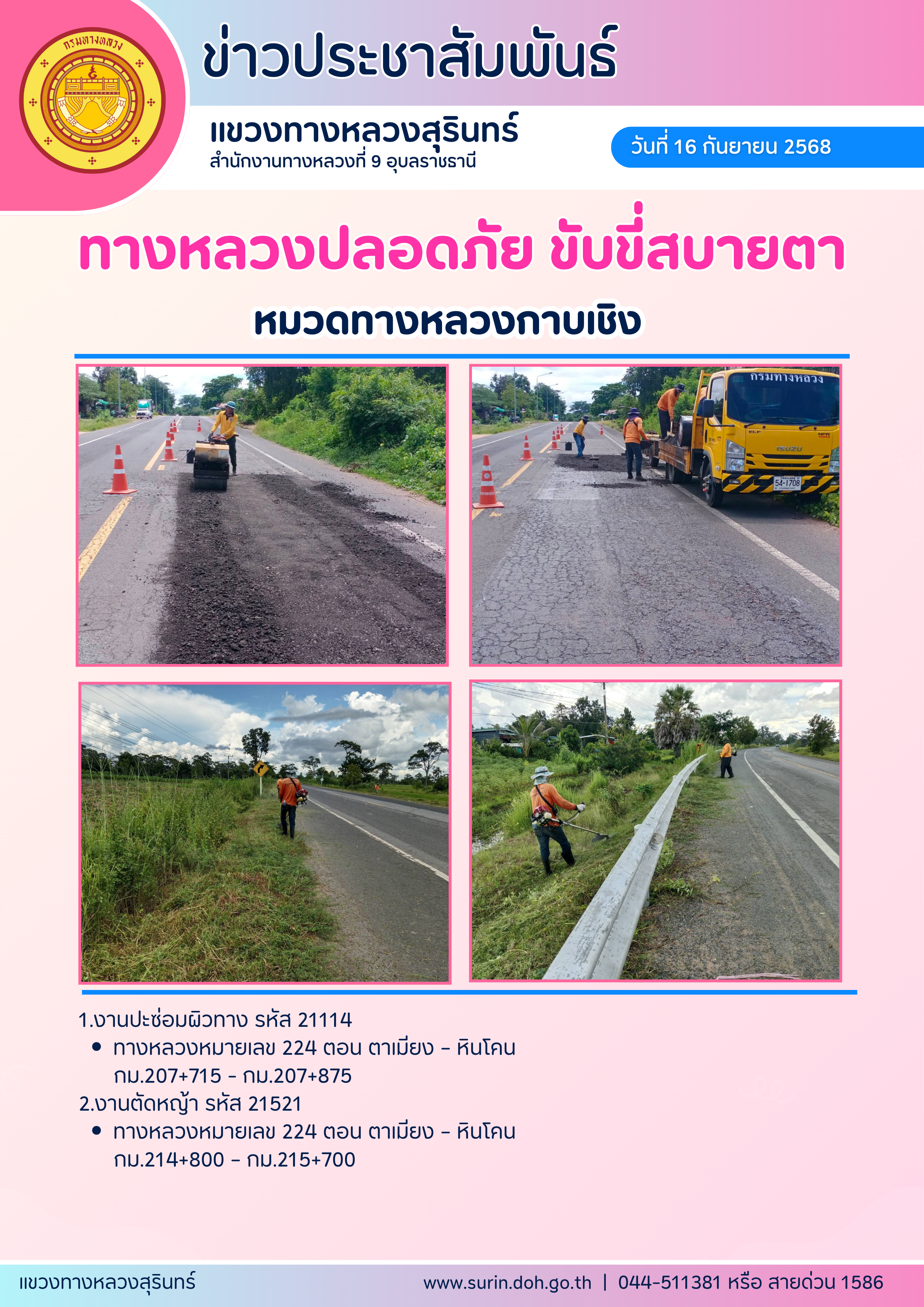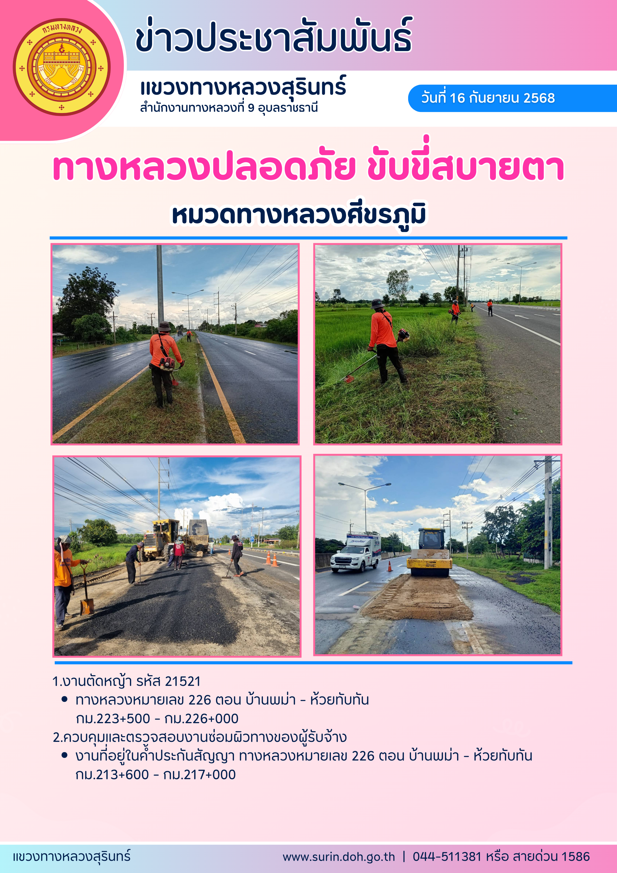ข้อมูลข่าว : ทางหลวงปลอดภัย ขับขี่สบายตา 16 กันยายน 2568