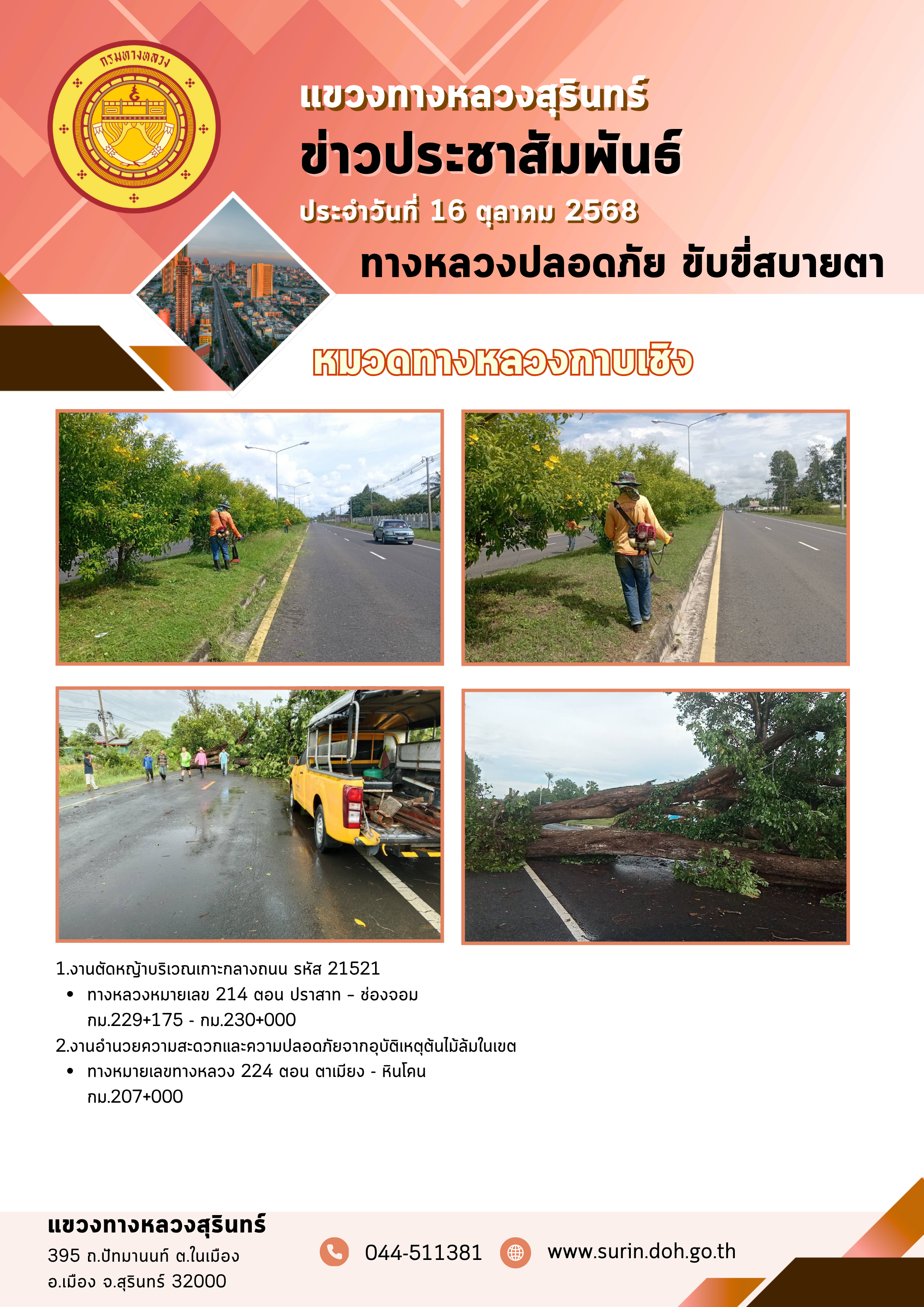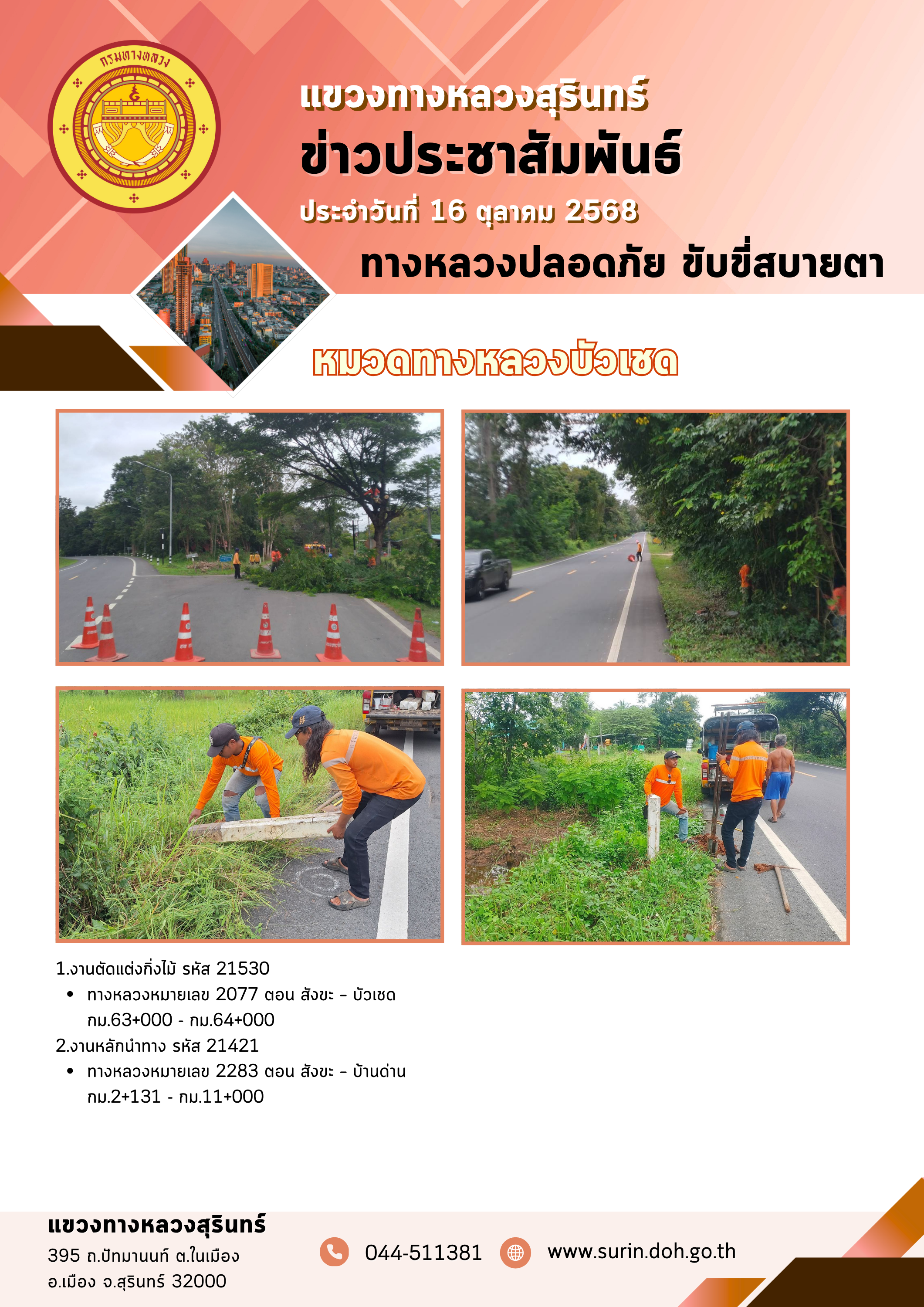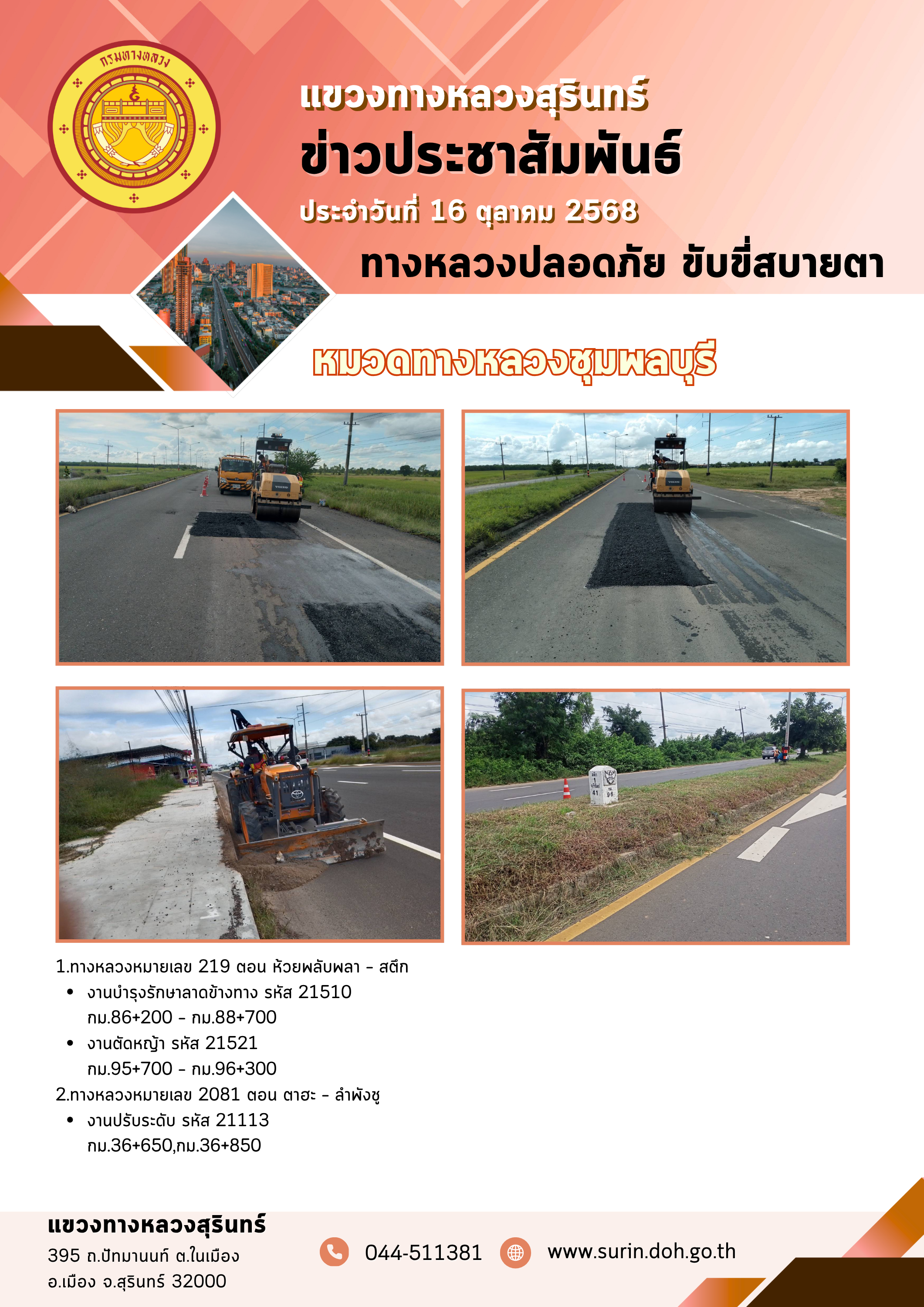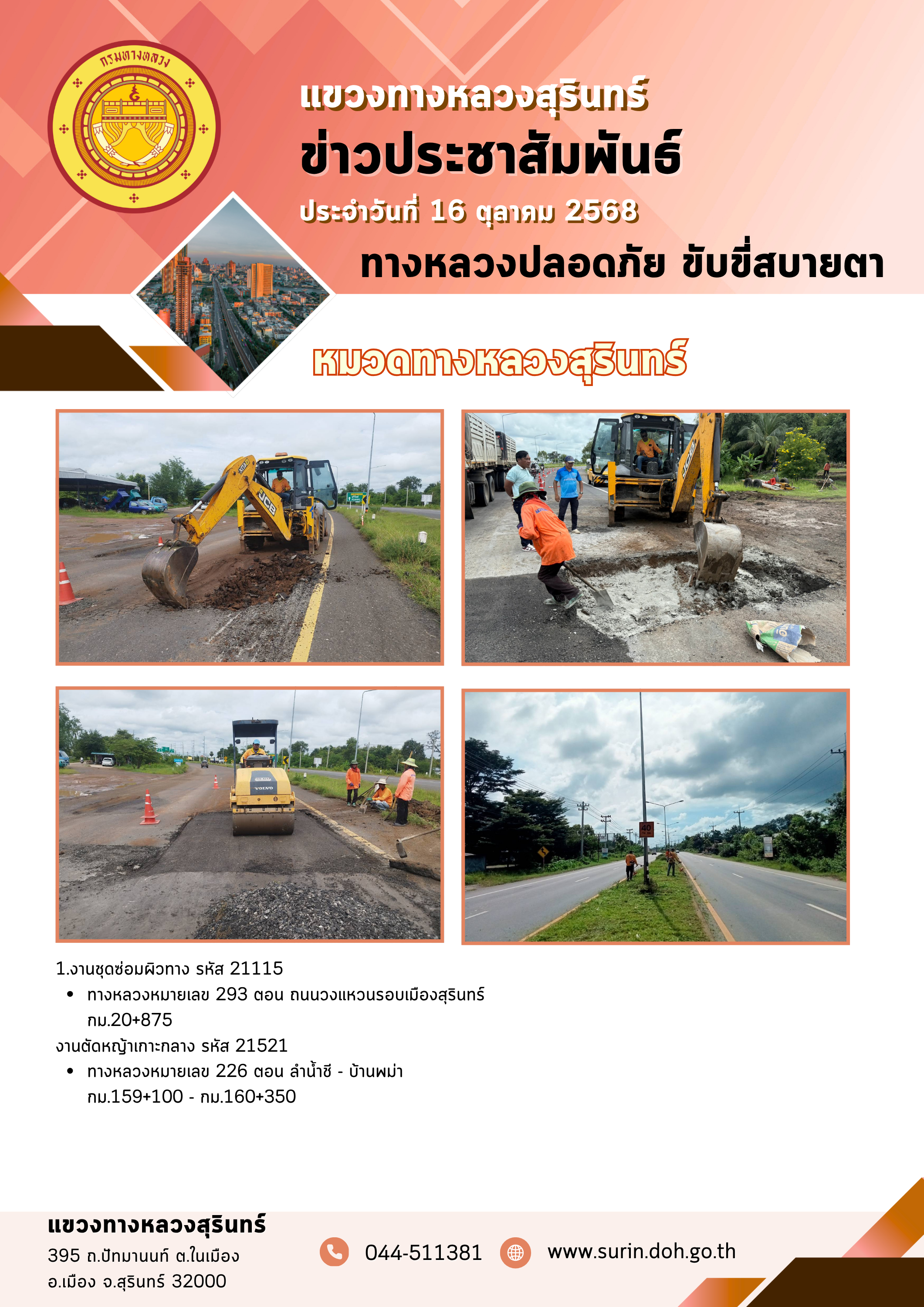 ข้อมูลข่าว : ทางหลวงปลอดภัย ขับขี่สบายตา 16 ตุลาคม 2568