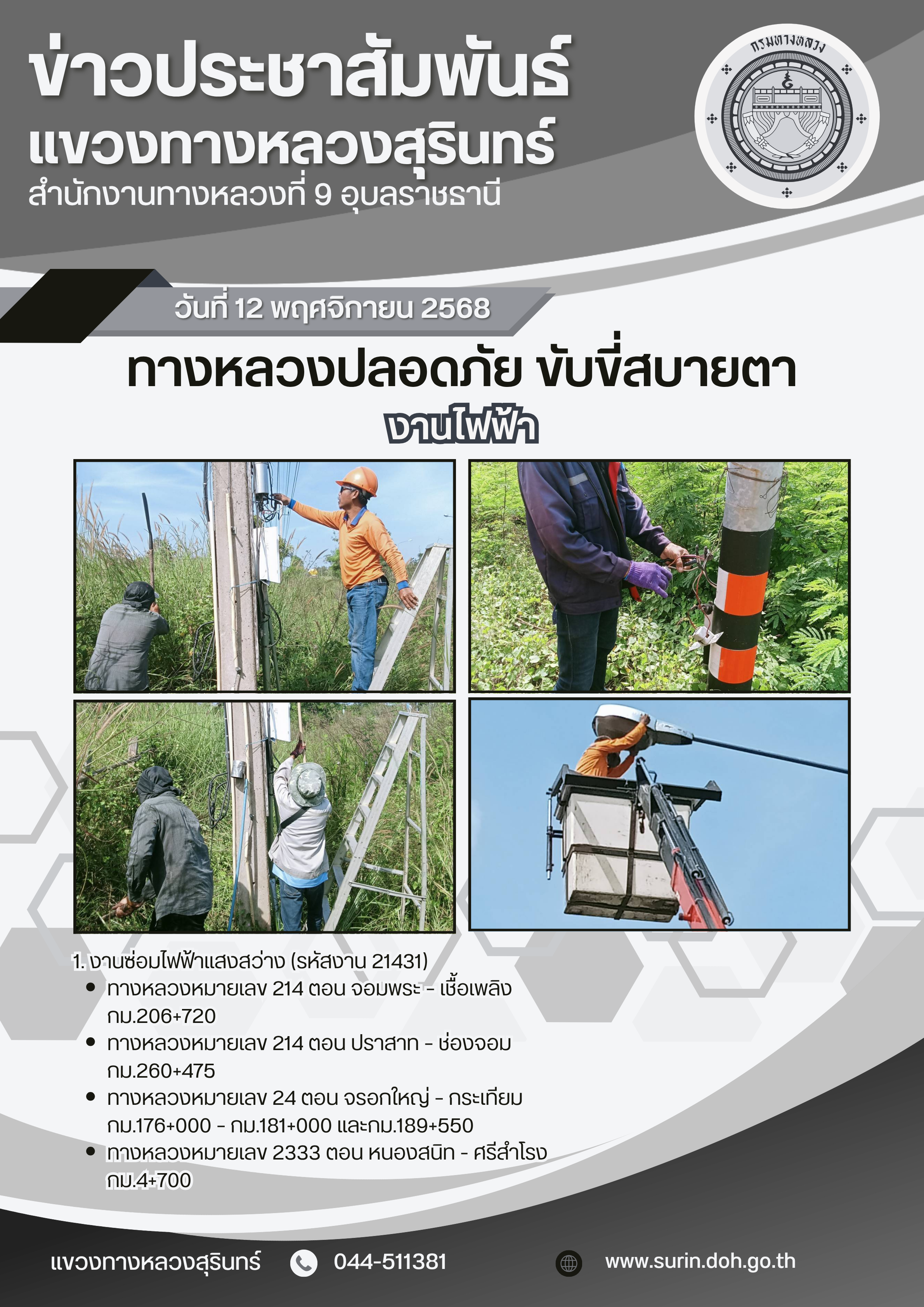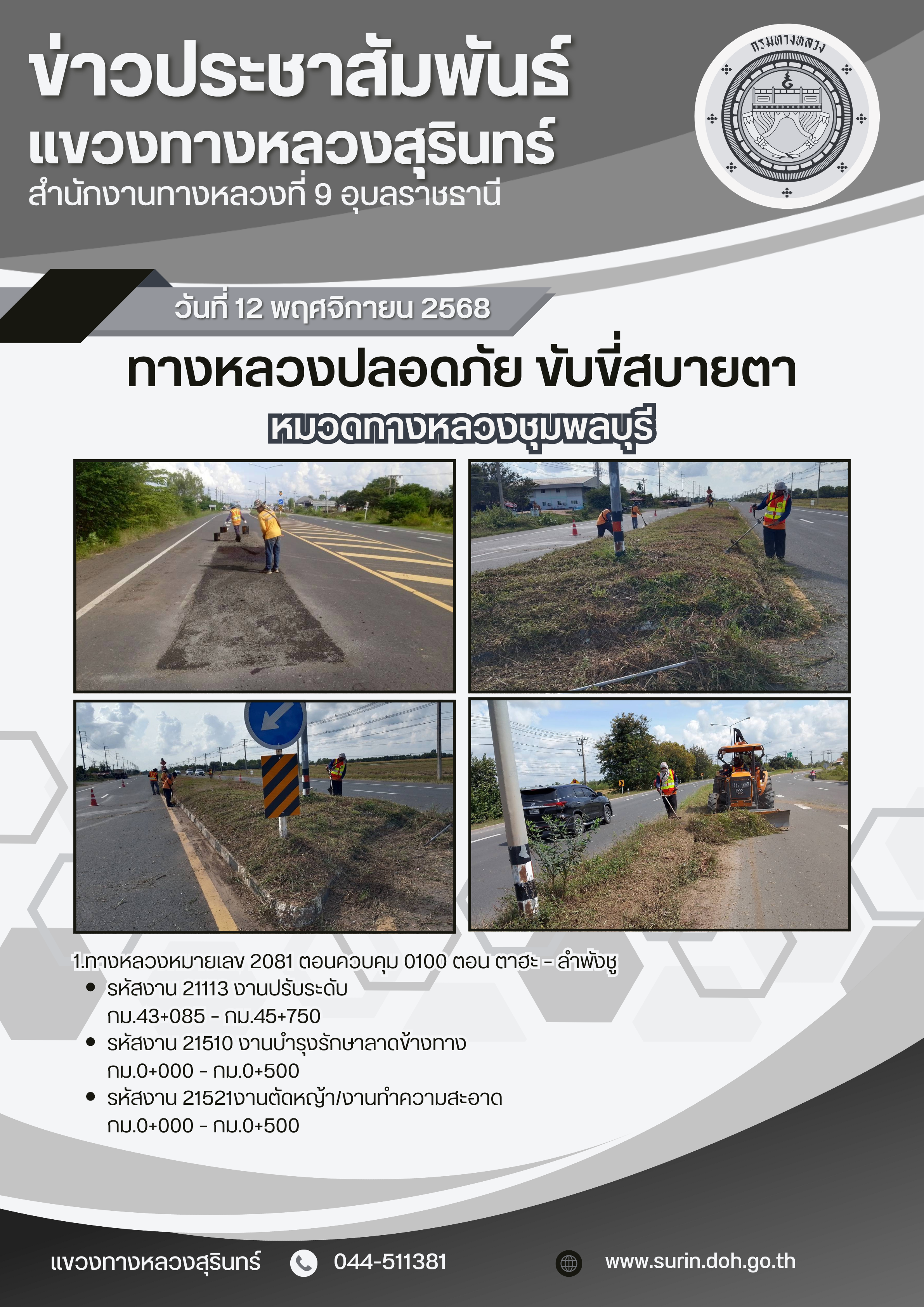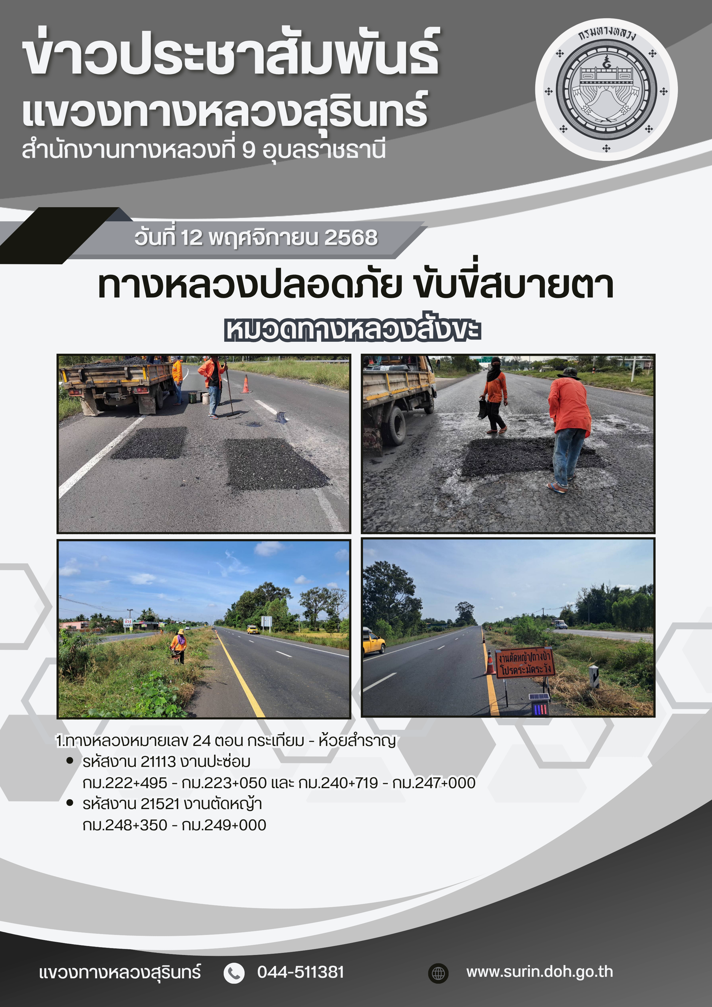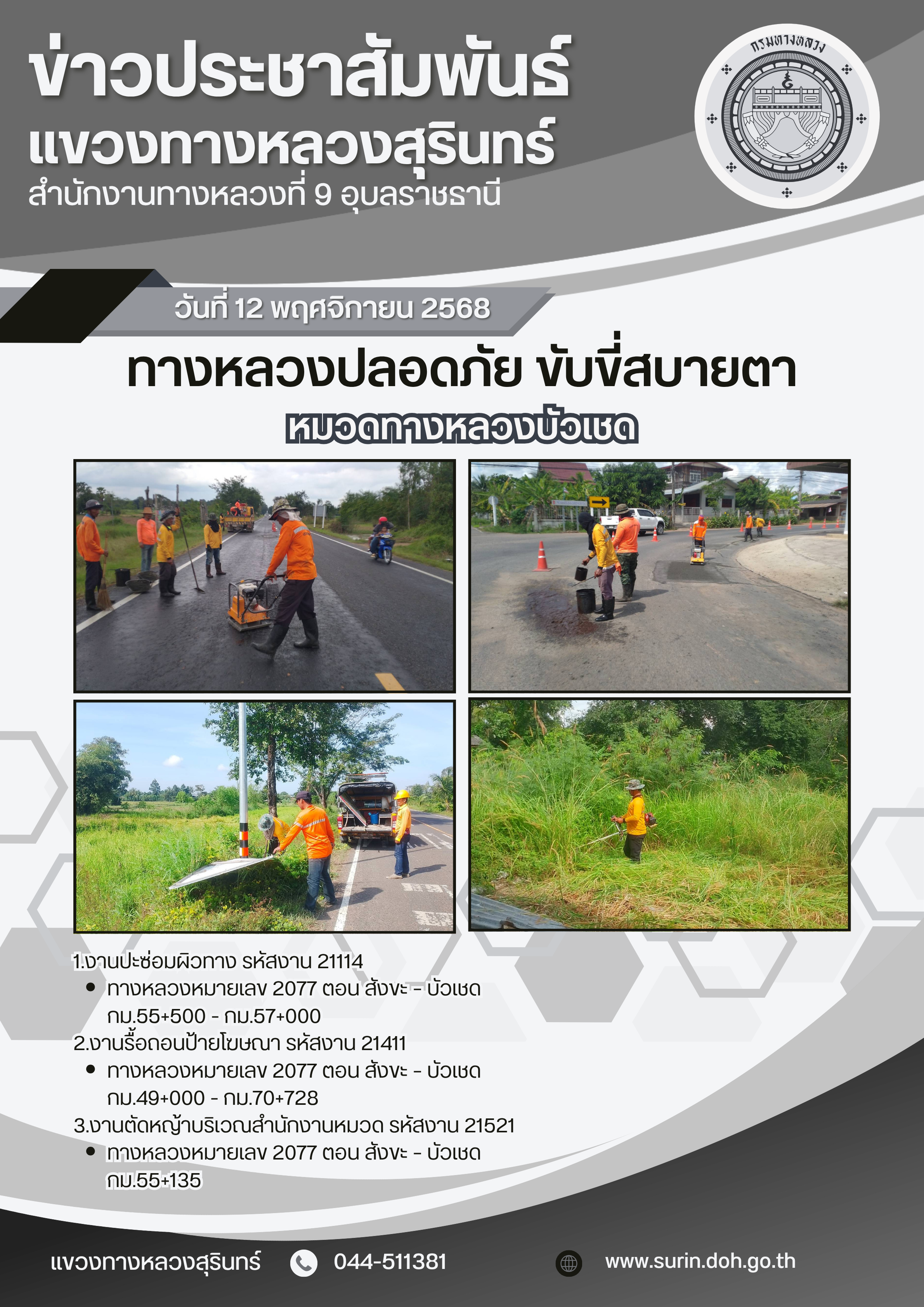 ข้อมูลข่าว : ทางหลวงปลอดภัย ขับขี่สบายตา 12 พฤศจิกายน 2568