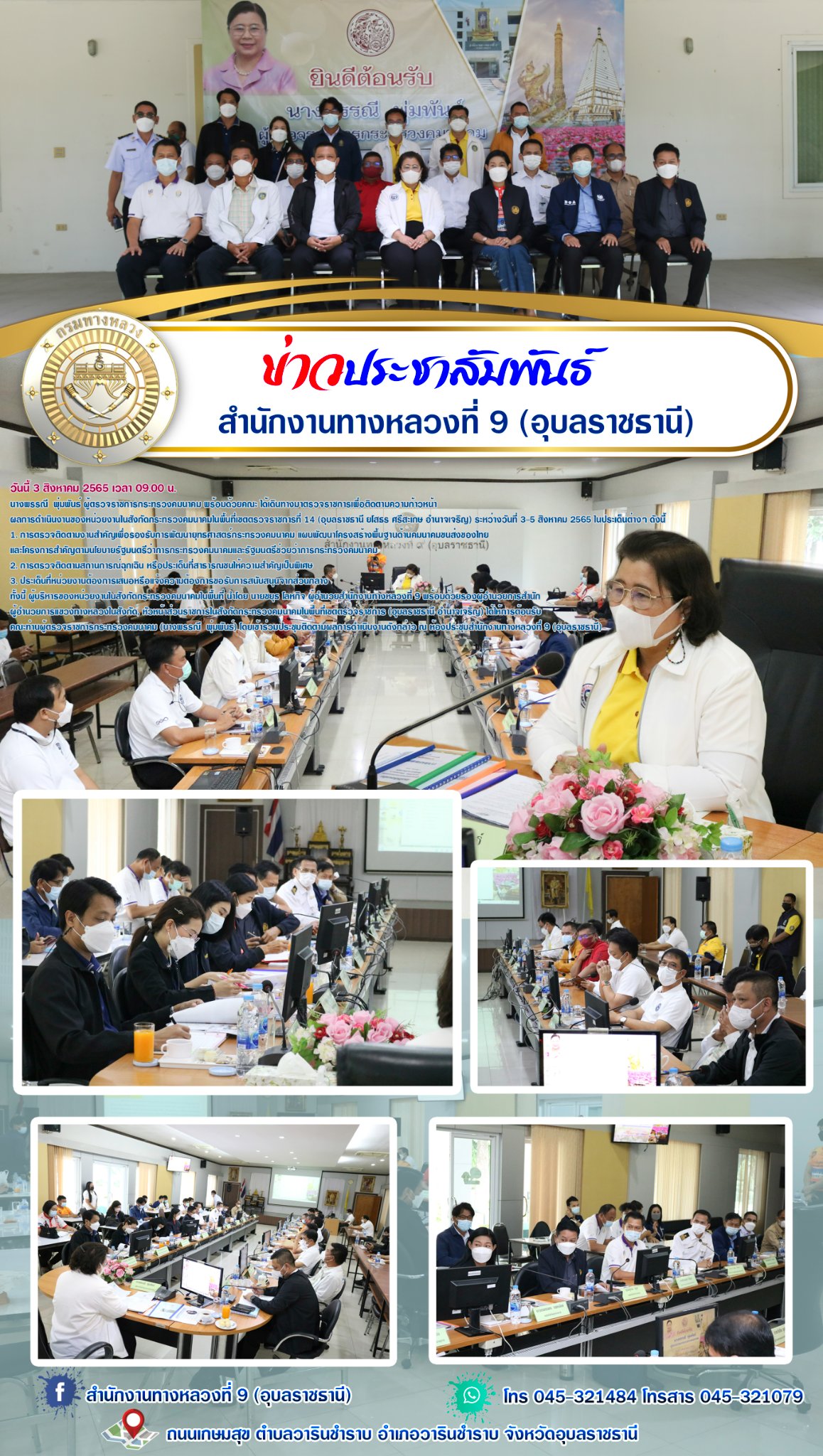 ทั้งนี้ ผู้บริหารของหน่วยงานในสังกัดกระทรวงคมนาคมในพื้นที่ นำโดย นายชยุธ โลหกิจ ผู้อำนวยสำนักงานทางหลวงที่ 9 พร้อมด้วยรองผู้อำนวยการสำนัก ผู้อำนวยการแขวงทางหลวงในสังกัด, หัวหน้าส่วนราชการในสังกัดกระทรวงคมนาคมในพื้นที่เขตตรวจราชการ (อุบลราชธานี อำนาจเจริญ) ได้ให้การต้อนรับคณะท่านผู้ตรวจราชการกระทรวงคมนาคม (นางพรรณี พุ่มพันธ์) โดยเข้าร่วมประชุมติดตามผลการดำเนินงานดังกล่าว ณ ห้องประชุมสำนักงานทางหลวงที่ 9 (อุบลราชธานี)