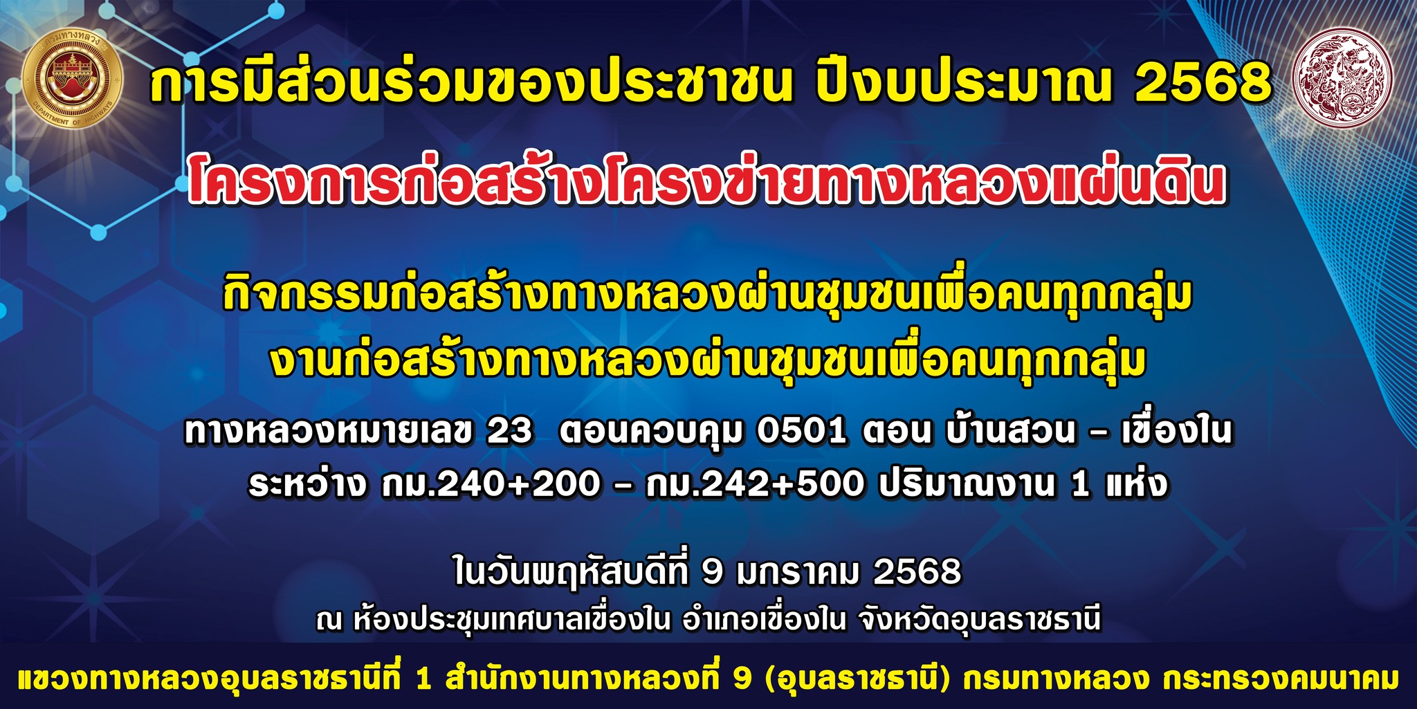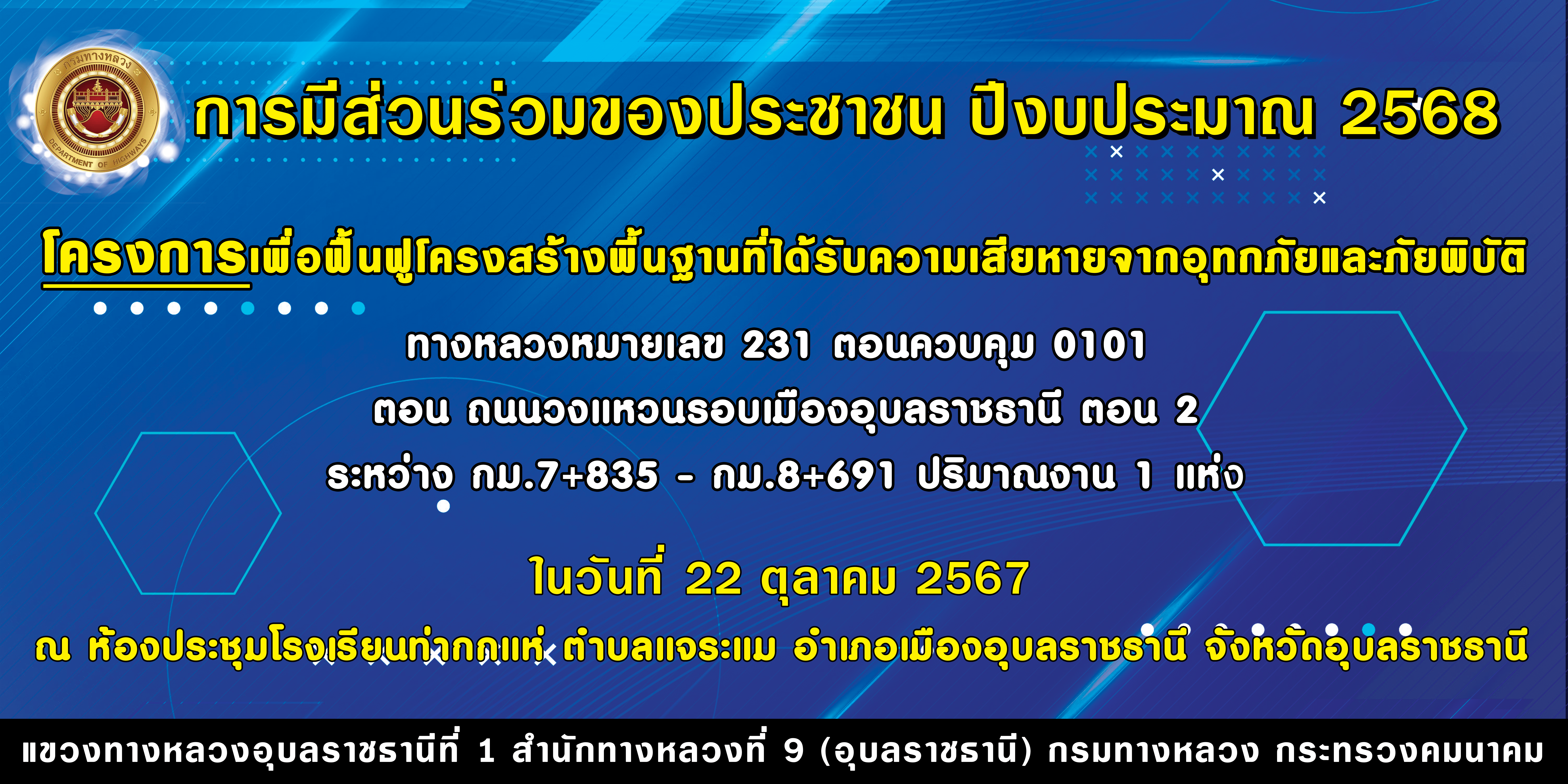 การประชุมการมีส่วนร่วมของประชาชน ปีงบประมาณ 2568 โครงการเพื่อฟื้นฟูโครงสร้างพื้นฐานที่ได้รับความเสียหายจากอุทกภัยและภัยพิบัติ ื่งหลวงหมายเลข 231 ตอนควบคุม 0101 ตอน ถนนวงแหวนรอบเมืองอุบลราชธานี ตอน 2 ระหว่าง กม.7+835 - กม.8+691 ปริมาณงาน 1 แห่ง