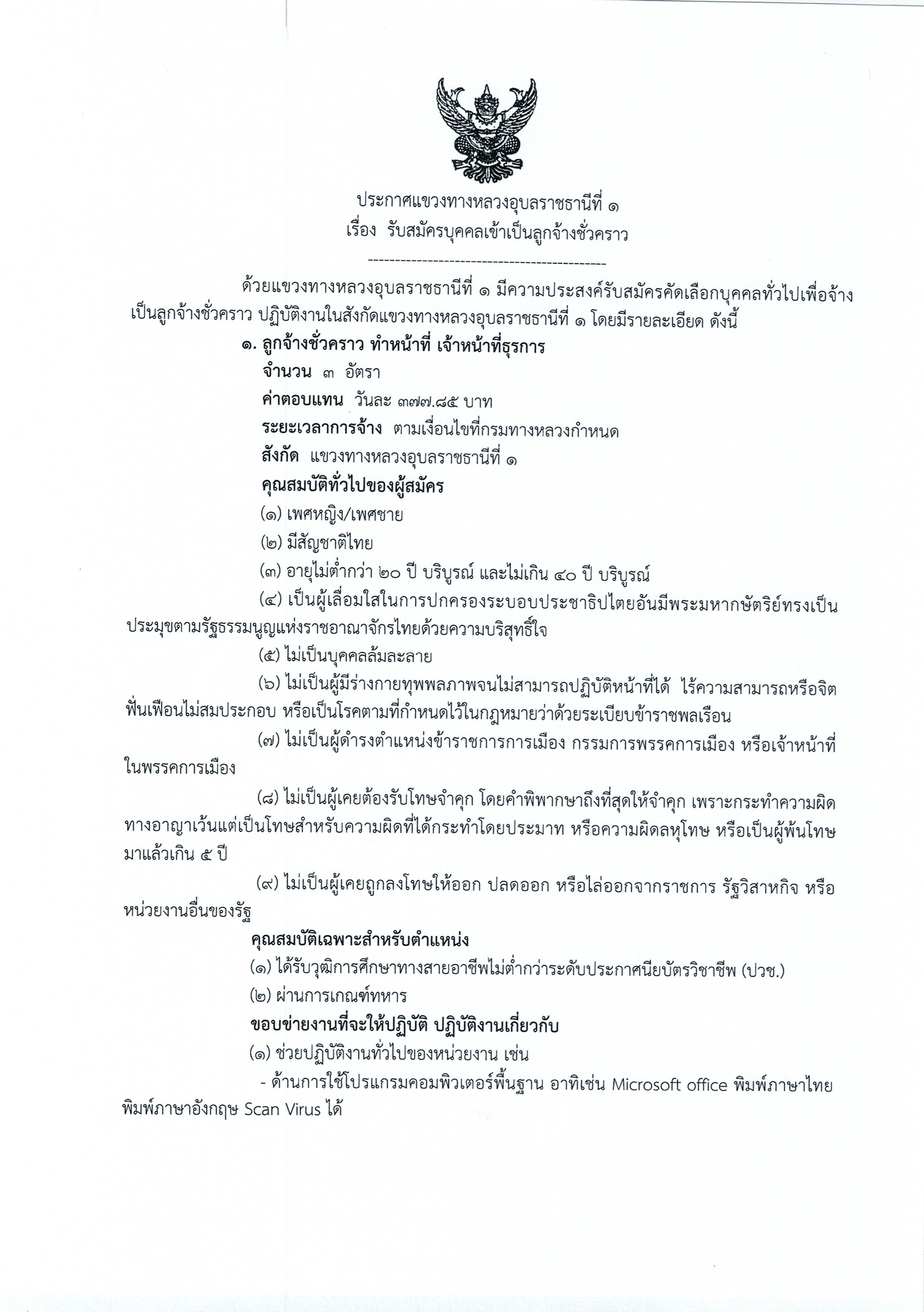 แขวงทางหลวงอุบลราชธานีที่ 1 "ประกาศรับ"สมัครคัดเลือกบุคคลทั่วไปเพื่อจ้างเป็นลูกจ้างชั่วคราว ปฏิบัติงานในสังกัดแขวงทางหลวงอุบลราชธานีที่ 1