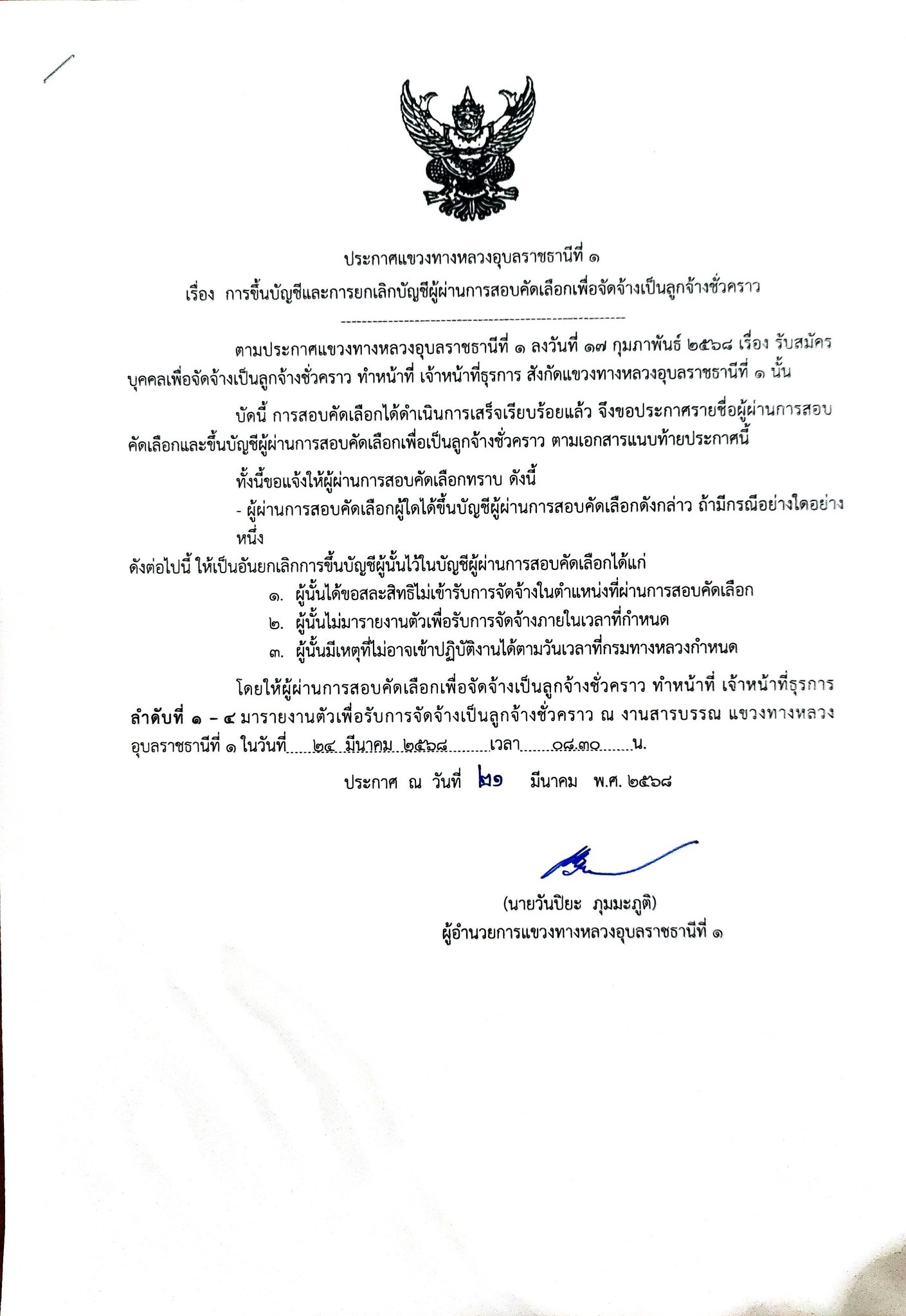แขวงทางหลวงอุบลราชธานีที่ 1 ประกาศรายชื่อผู้มีสิทธิ์เข้ารับการสอบคัดเลือกเพื่อเป็นลูกจ้างชั่วคราว ขอให้ผู้ที่มีรายชื่อเข้ารับการสอบคัดเลือกโดยวิธีการสอบข้อเขียน ซึ่งเลื่อนการสอบจากวันอังคารที่ 4 มีนาคม 2568 เป็นวันอังคารที่ 11 มีนาคม 2568 เวลา 09.30 น เป็นต้นไป