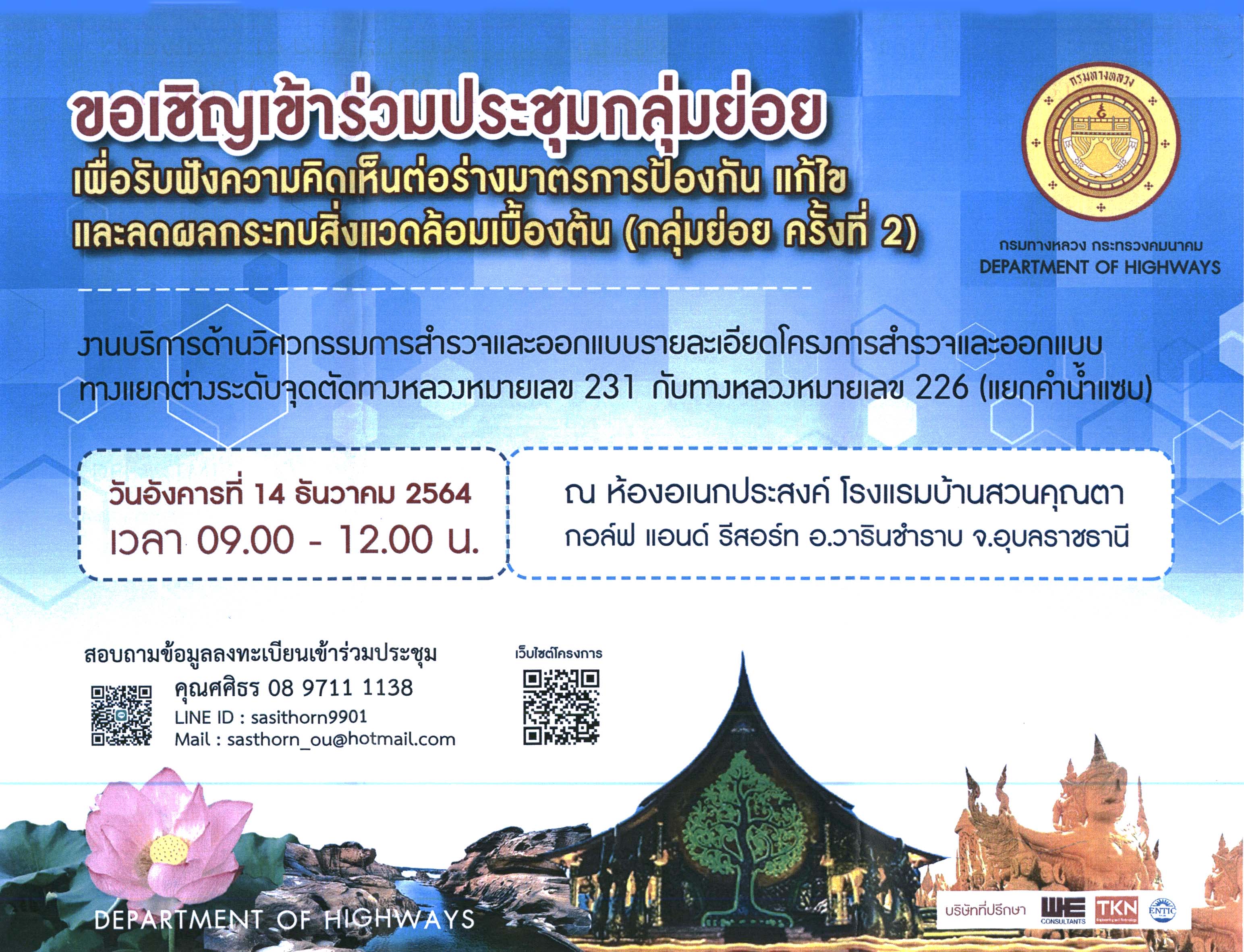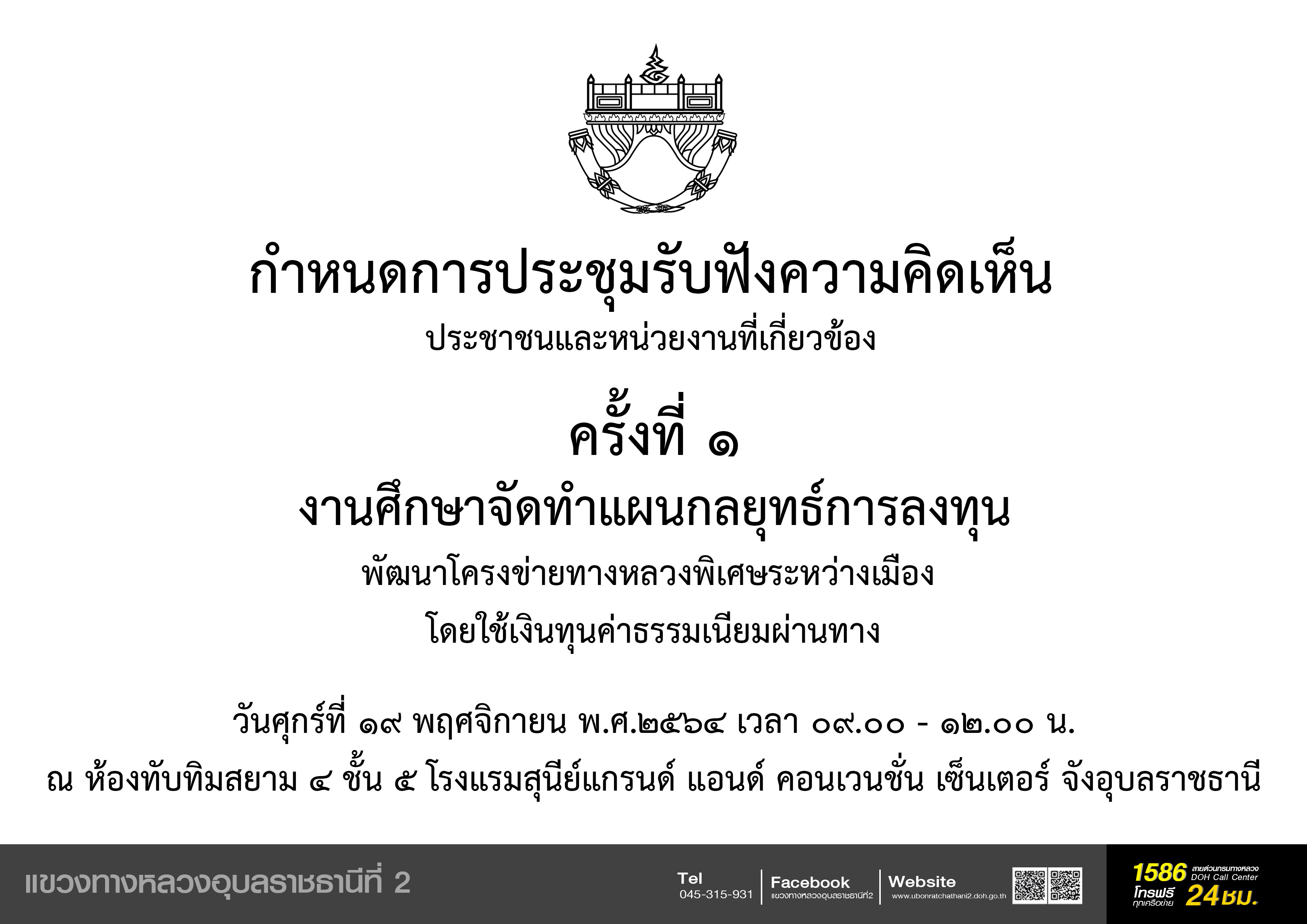 ขอความอนุเคราะห์ในการติดประกาศเชิญเข้าร่วมการประชุม รับฟังความคิดเห็นประชาชน และหน่วยงานที่เกี่ยวข้อง (ครั้งที่ 2)งานศึกษาจัดทำแผนแม่บทการพัฒนาโครงข่ายทางหลวงพิเศษ ระหว่างเมืองและระบบราง (MR-MAP)