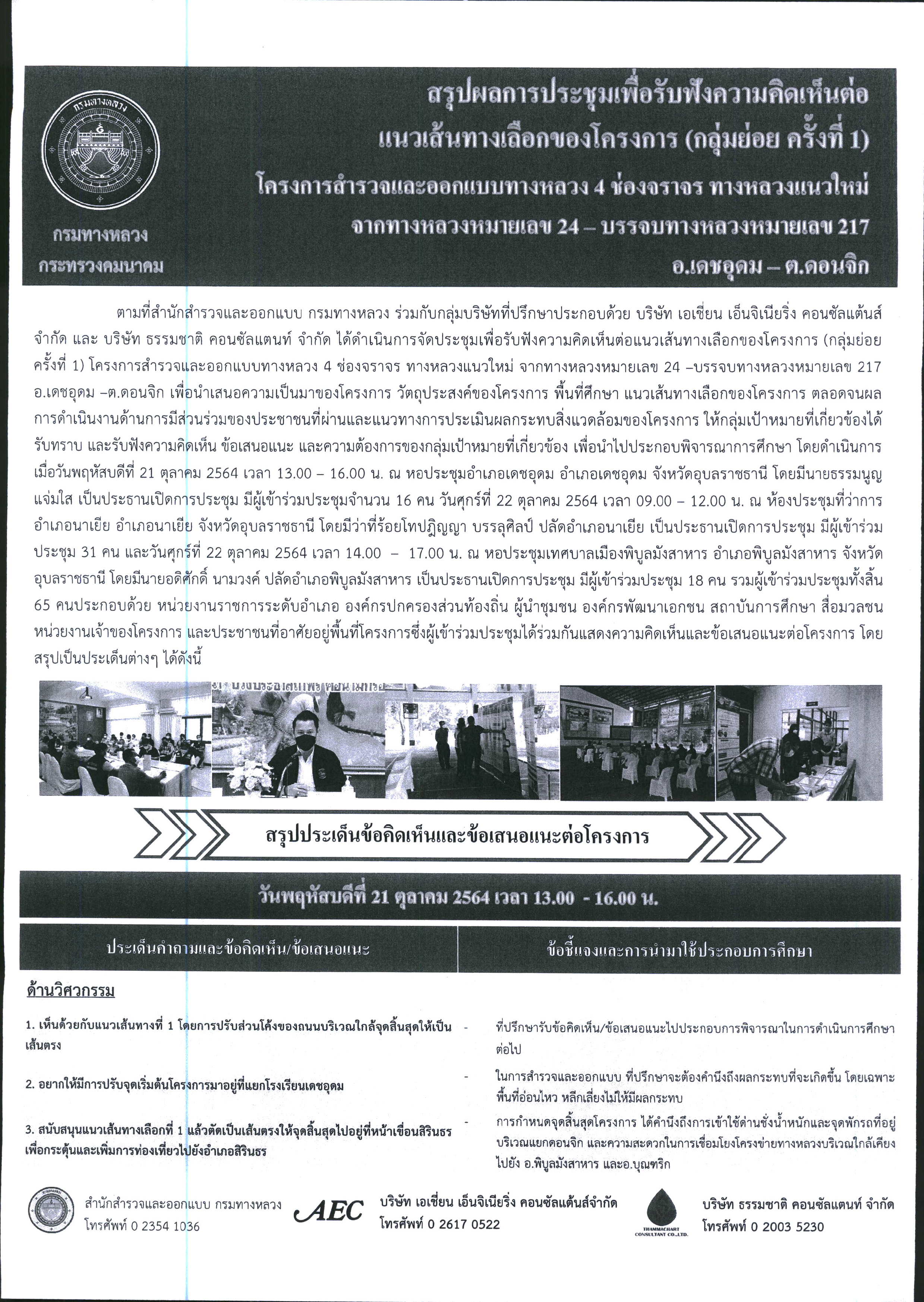 สรุปผลการประชุมปฐมนิเทศโครงการ (สัมมนา ครั้งที่ 1) โครงการสำรวจและออกแบบทางหลวง 4 ช่องจราจร ทางหลวงแนวใหม่จากทางหลวงหมายเลข 24 - บรรจบทางหลวงหมายเลข 217 อ.เดชอุดม - ต.ดอนจิก