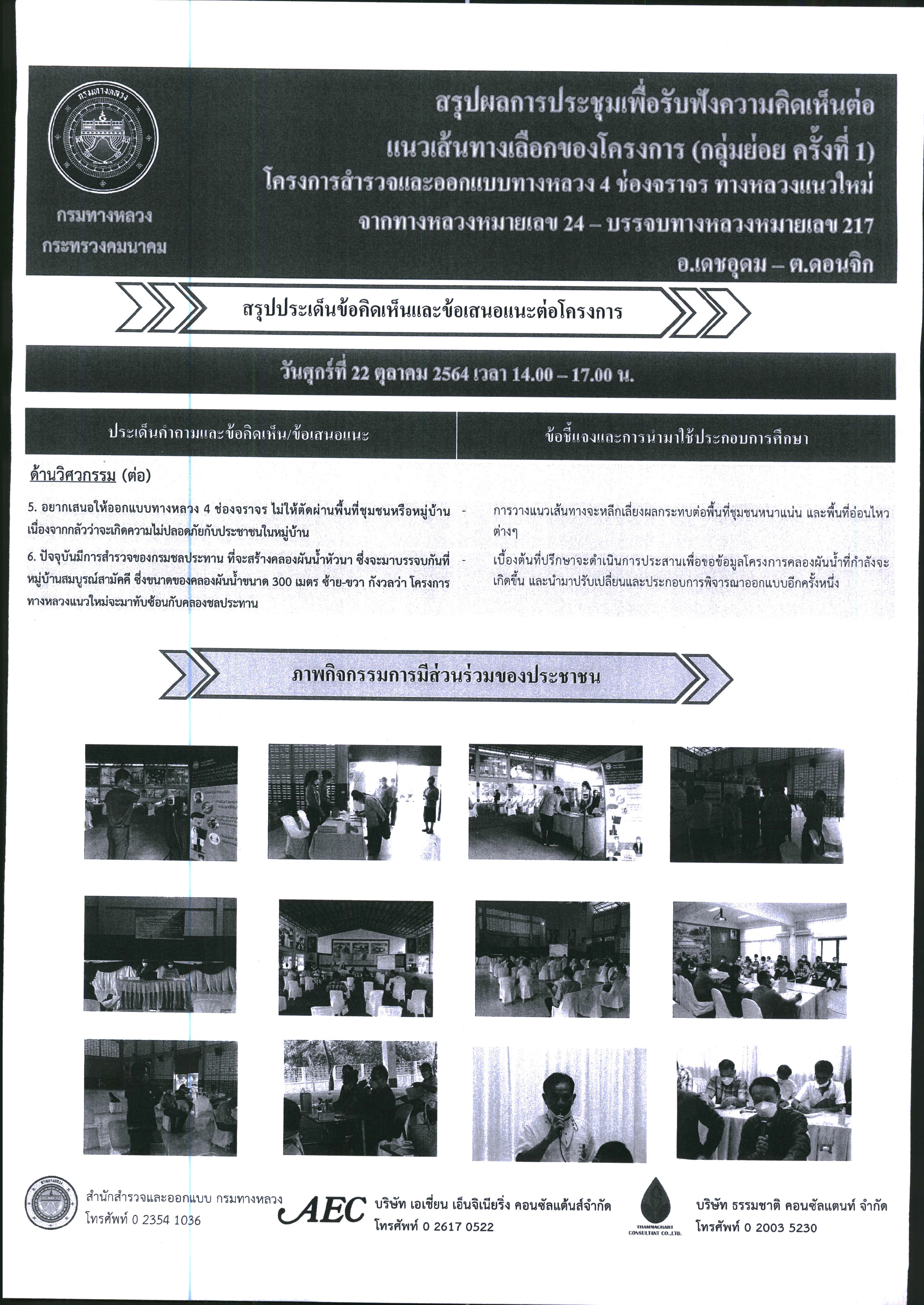 สรุปผลการประชุมเพื่อรับฟังความคิดเห็นต่อแนวทางเลือกของโครงการ (กลุ่มย่ิย ครั้งที่ 1) โครงการสำรวจและออกแบบทางหลวง 4 ช่องจราจร