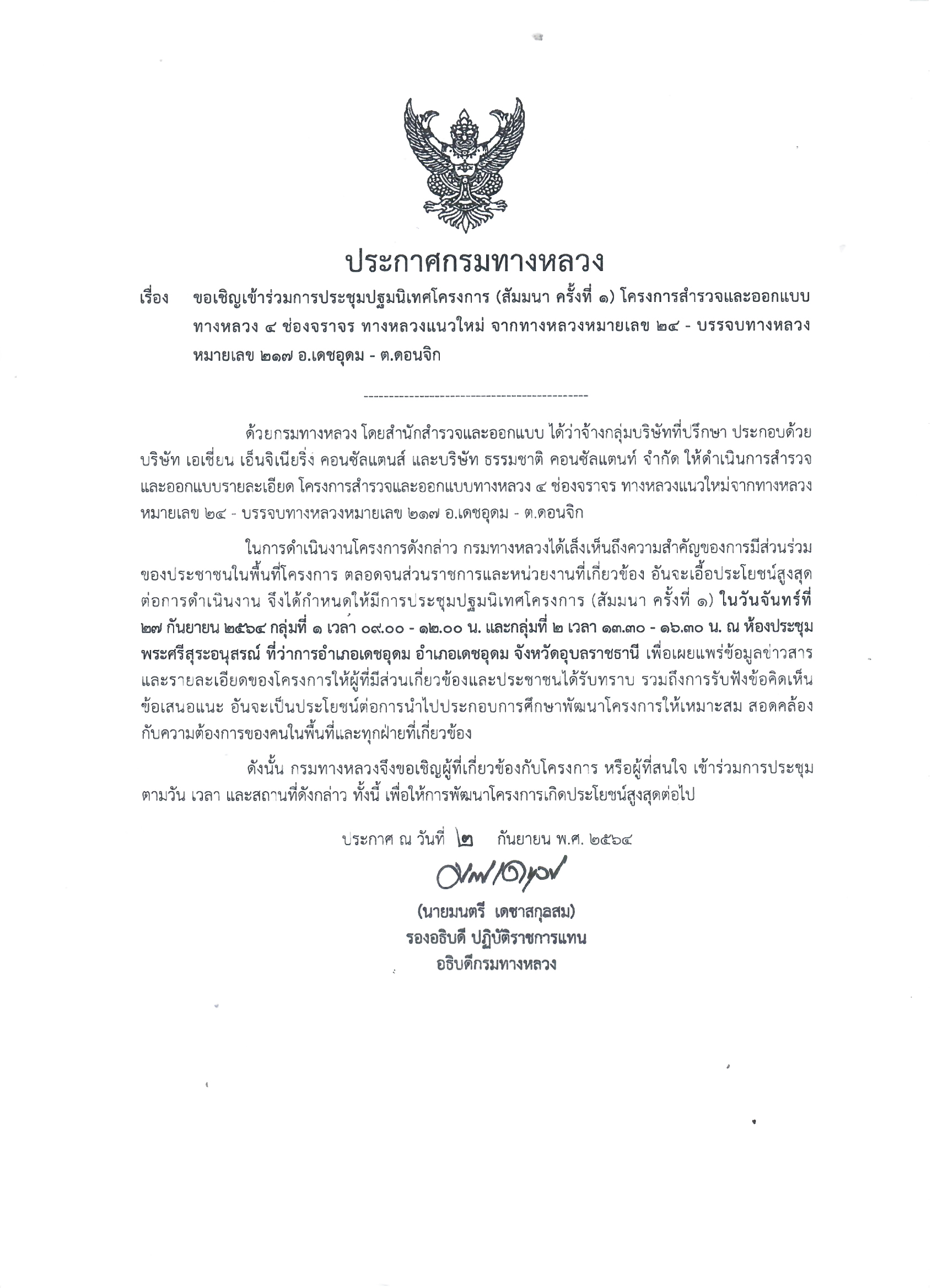 โครงการสำรวจและออกแบบทางหลวง 4 ช่องจราจร ทางหลวงแนวใหม่จากทางหลวงหมายเลข 24 - บรรจบทางหลวงหมายเลข 217 อ.เดชอุดม - ต.ดอนจิก จ.อุบลราชธานี