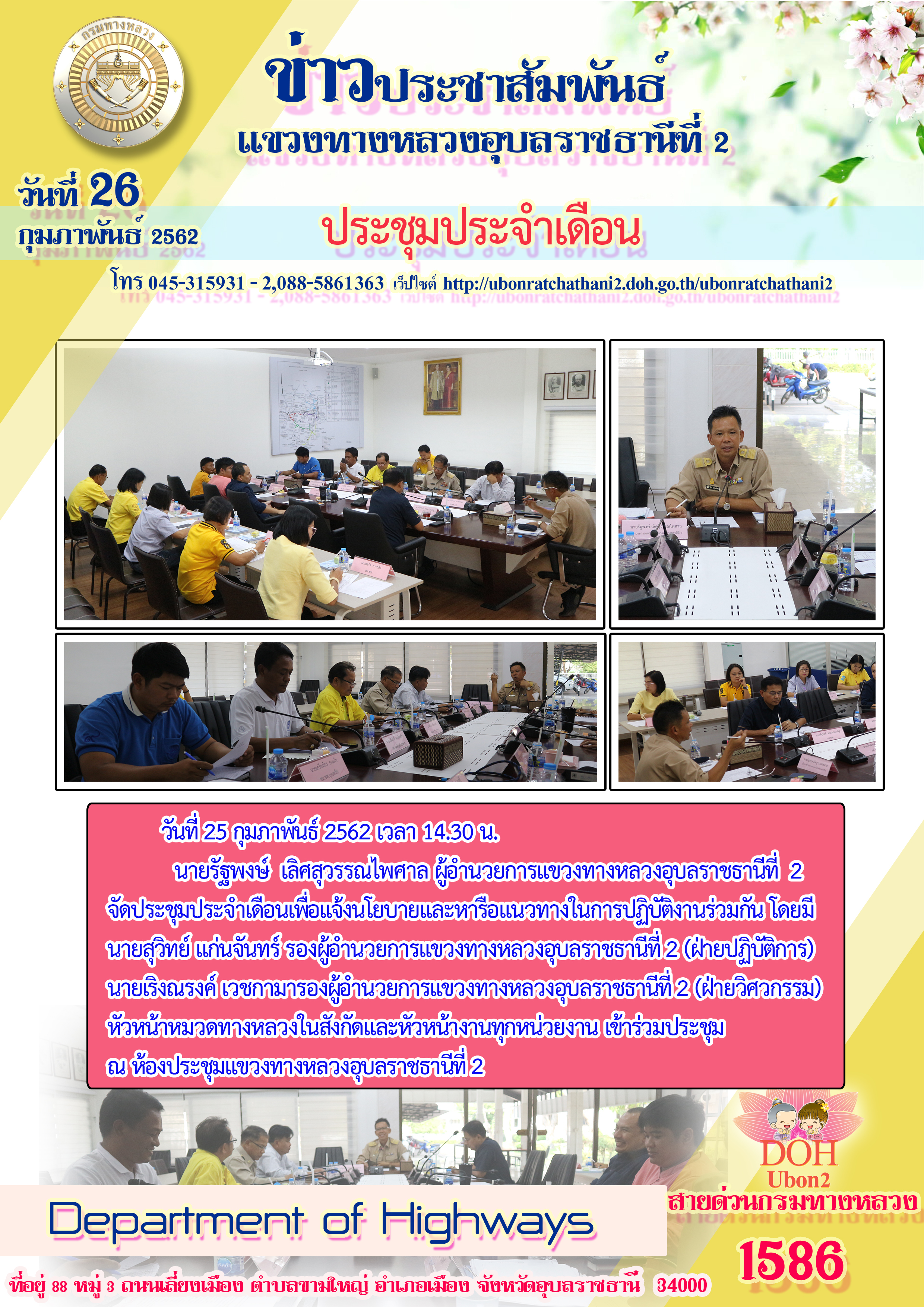 นายรัฐพงษ์ เลิศสุวรรณไพศาล ผู้อำนวยการแขวงทางหลวงอุบลราชธานีที่ 2 จัดประชุมประจำเดือนเพื่อแจ้งนโยบายและหารือแนวทางในการปฏิบัติงานร่วมกัน โดยมี นายสุวิทย์ แก่นจันทร์ รองผู้อำนวยการแขวงทางหลวงอุบลราชธานีที่ 2 (ฝ่ายปฏิบัติการ) นายเริงณรงค์ เวชกามารองผู้อำนวยการแขวงทางหลวงอุบลราชธานีที่ 2 (ฝ่ายวิศวกรรม) หัวหน้าหมวดทางหลวงในสังกัดและหัวหน้างานทุกหน่วยงาน เข้าร่วมประชุม ณ ห้องประชุมแขวงทางหลวงอุบลราชธานีที่ 2