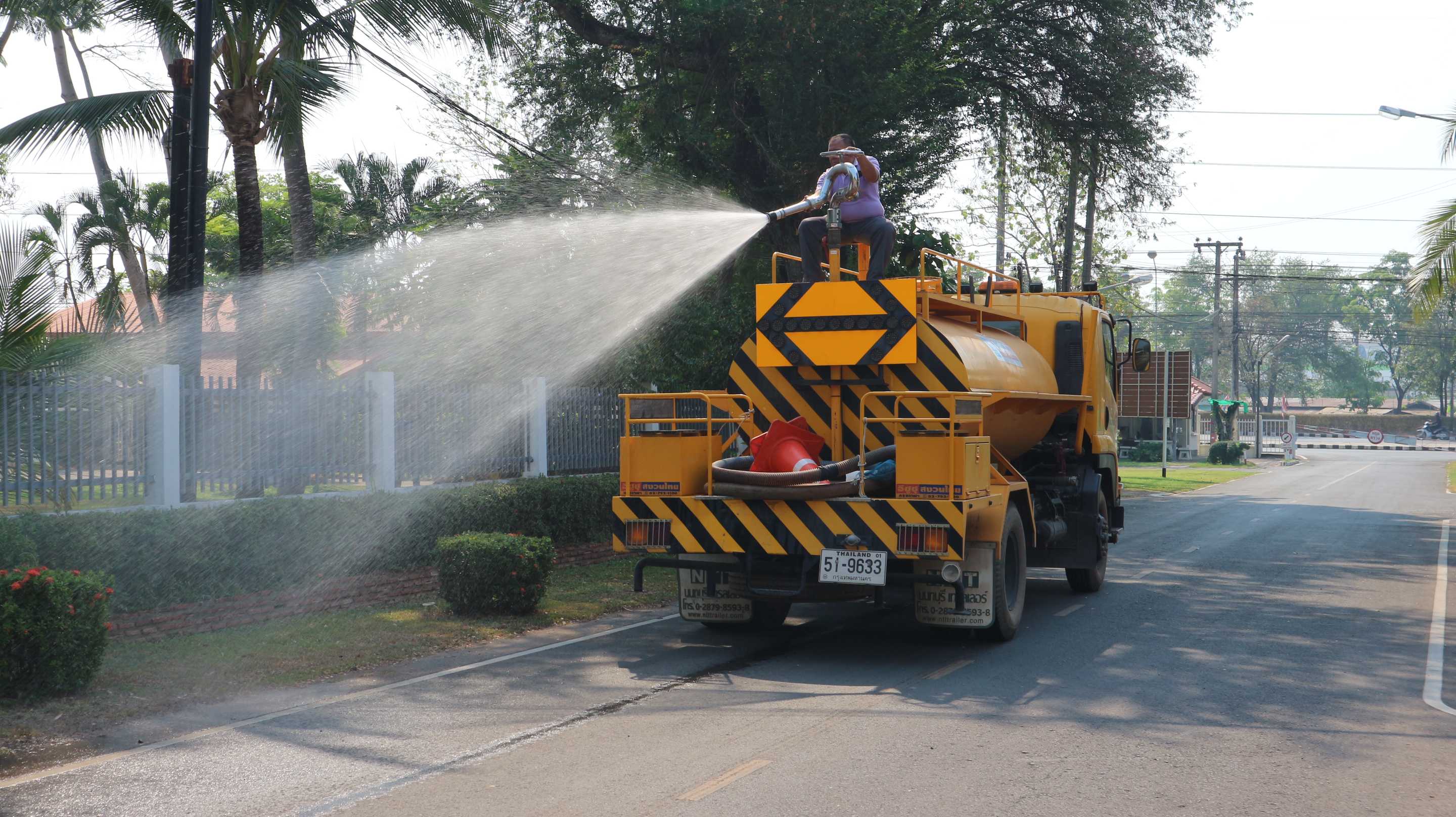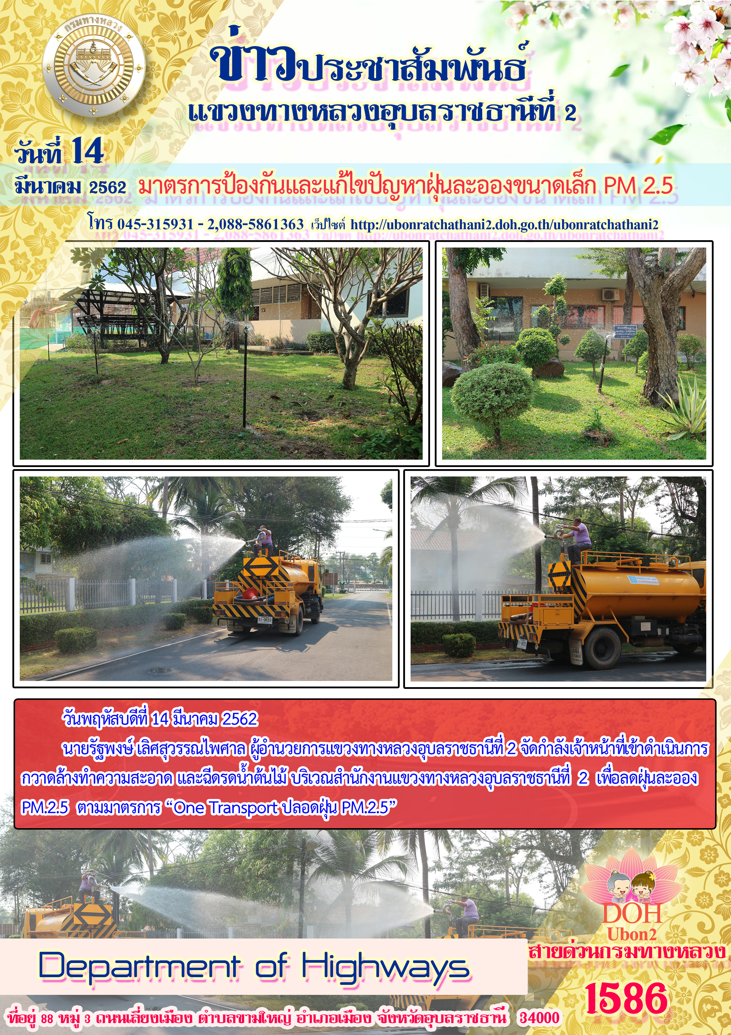 นายรัฐพงษ์ เลิศสุวรรณไพศาล ผู้อำนวยการแขวงทางหลวงอุบลราชธานีที่ 2 จัดกำลังเจ้าหน้าที่เข้าดำเนินการ กวาดล้างทำความสะอาด และฉีดรดน้ำต้นไม้ บริเวณสำนักงานแขวงทางหลวงอุบลราชธานีที่ 2 เพื่อลดฝุ่นละออง PM.2.5 ตามมาตรการ “One Transport ปลอดฝุ่น PM.2.5”
