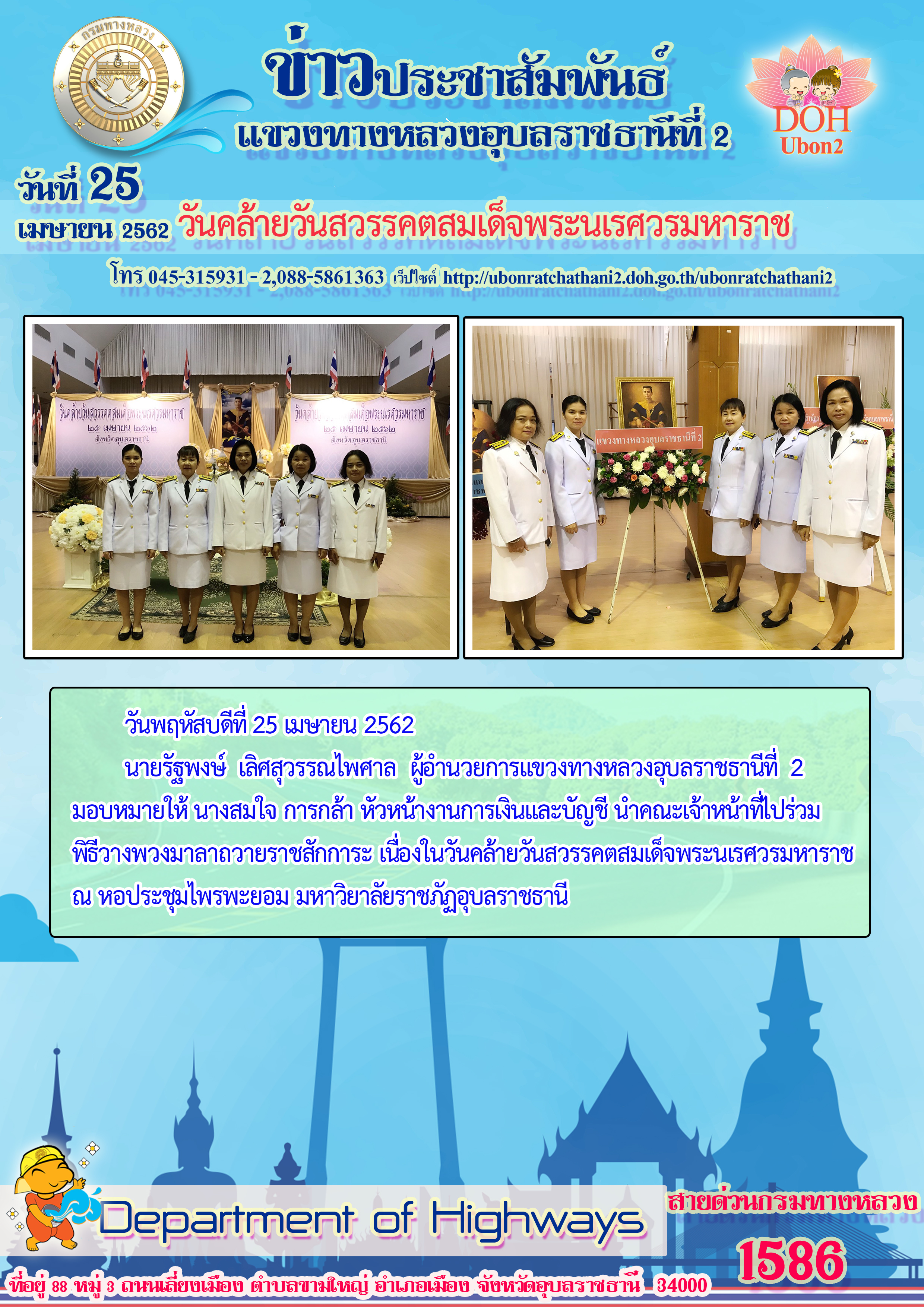 นายรัฐพงษ์ เลิศสุวรรณไพศาล ผู้อำนวยการแขวงทางหลวงอุบลราชธานีที่ 2 มอบหมายให้ นางสมใจ การกล้า หัวหน้างานการเงินและบัญชี นำคณะเจ้าหน้าที่ไปร่วม พิธีวางพวงมาลาถวายราชสักการะ เนื่องในวันคล้ายวันสวรรคตสมเด็จพระนเรศวรมหาราช ณ หอประชุมไพรพะยอม มหาวิยาลัยราชภัฏอุบลราชธานี