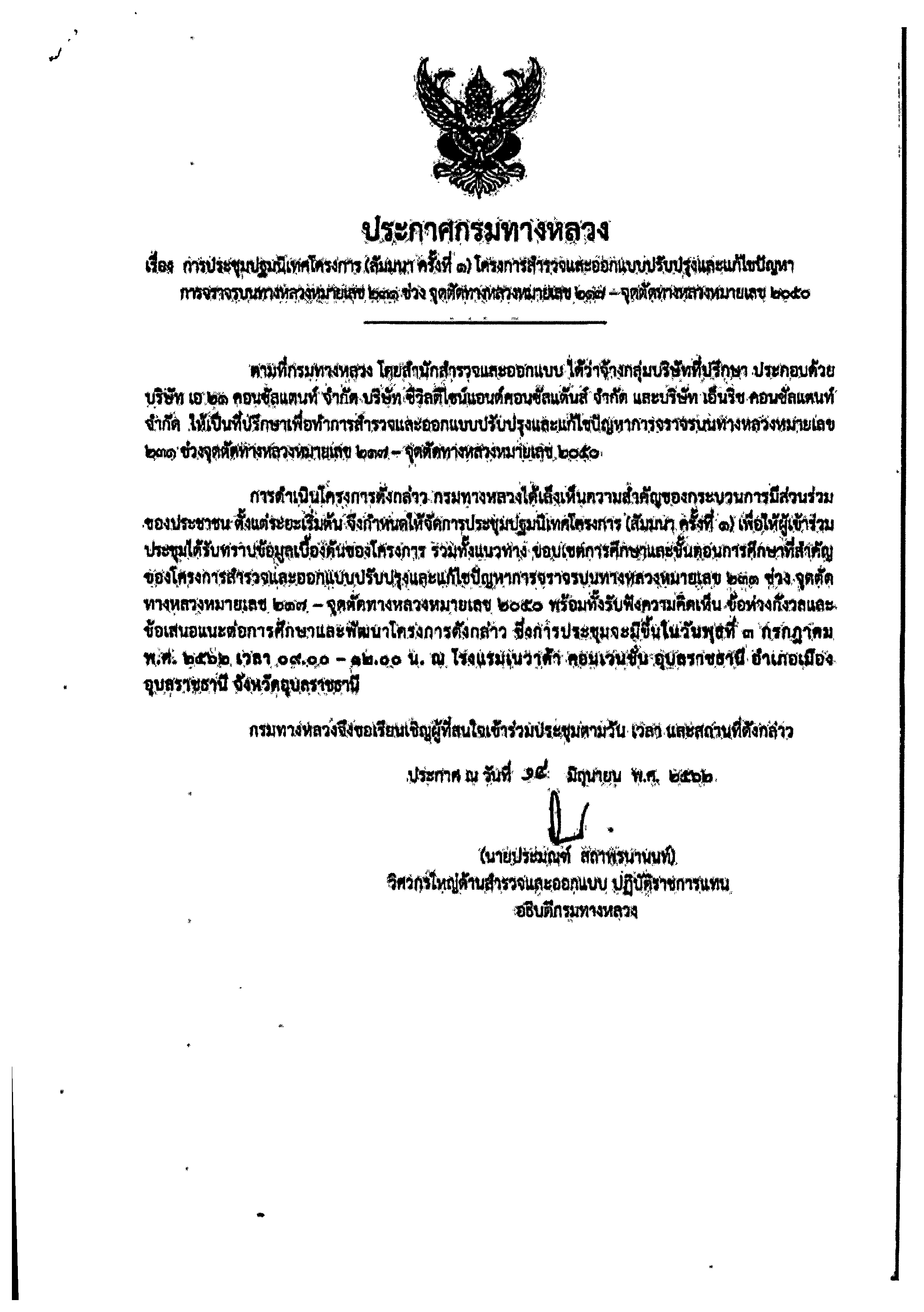 ขอเรียนเชิญผู้ที่สนใจในการมีส่วนร่วม ในโครงการสำรวจและออกแบบปรับปรุงและแก้ไขปัญหาการจราจรบนทางหลวงหมายเลข 231 ช่วงจุดตัด ทางหลวงหมายเลข 217 - จุดตัดทางหลวงหมายเลข 2050 เพื่อเสนอแนะต่อการศึกษาและพัฒนาโครงกา